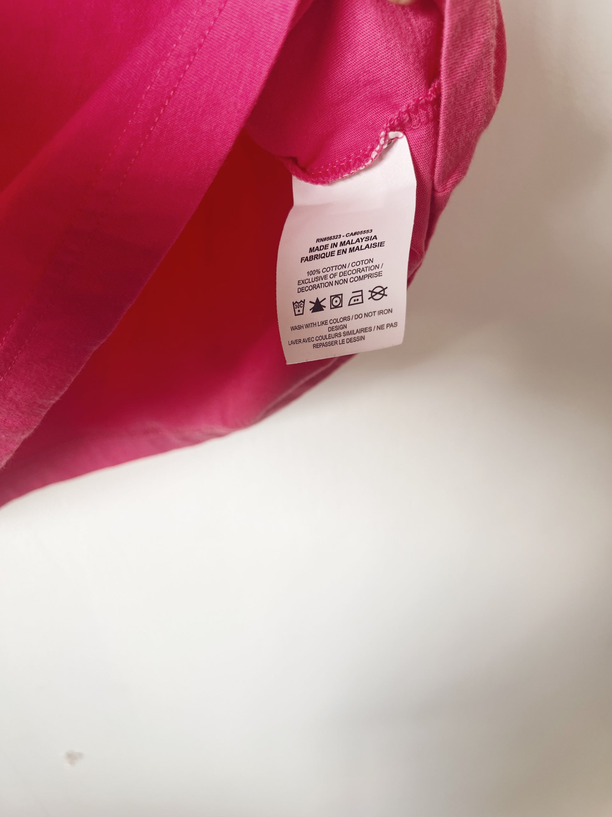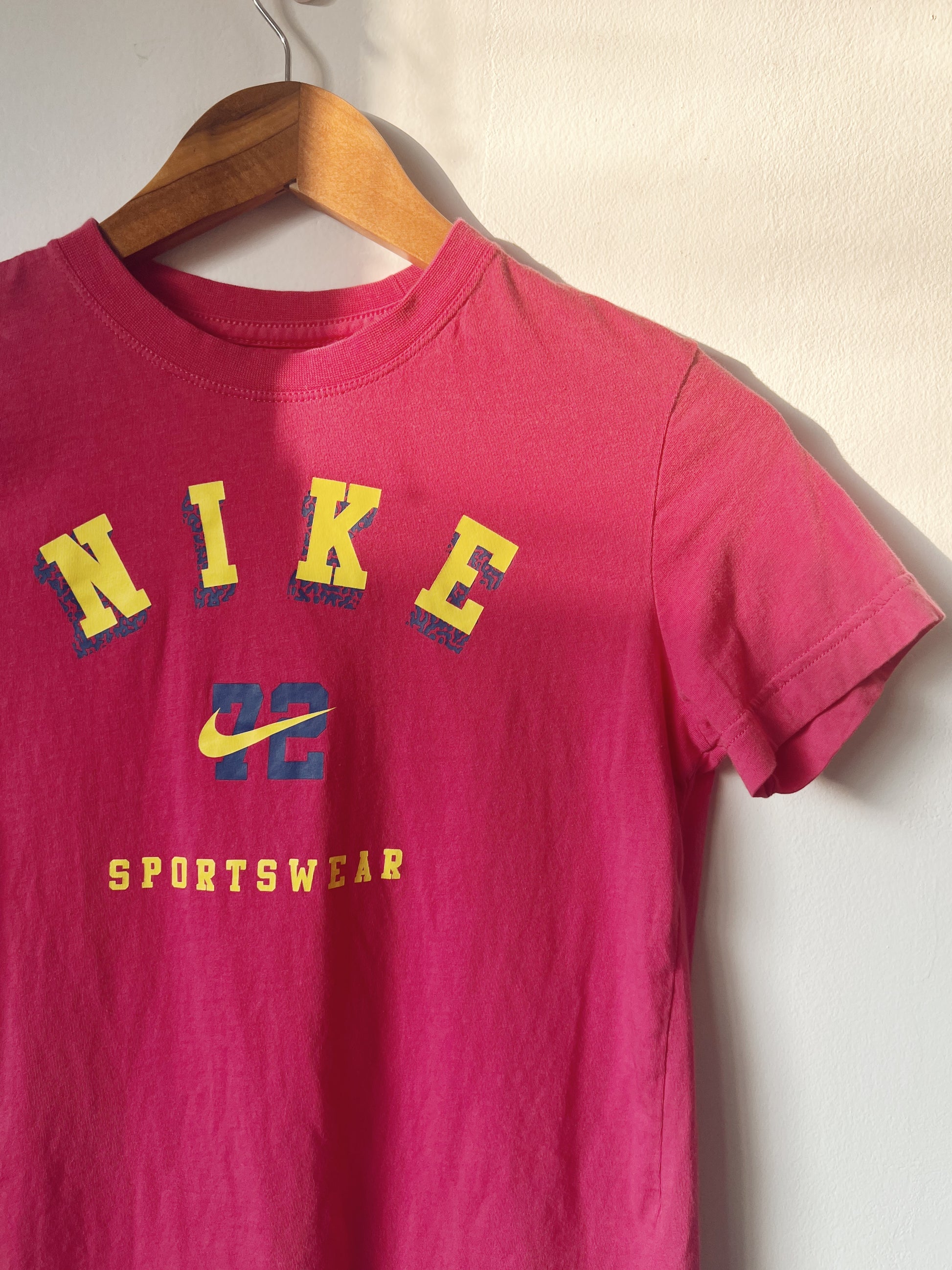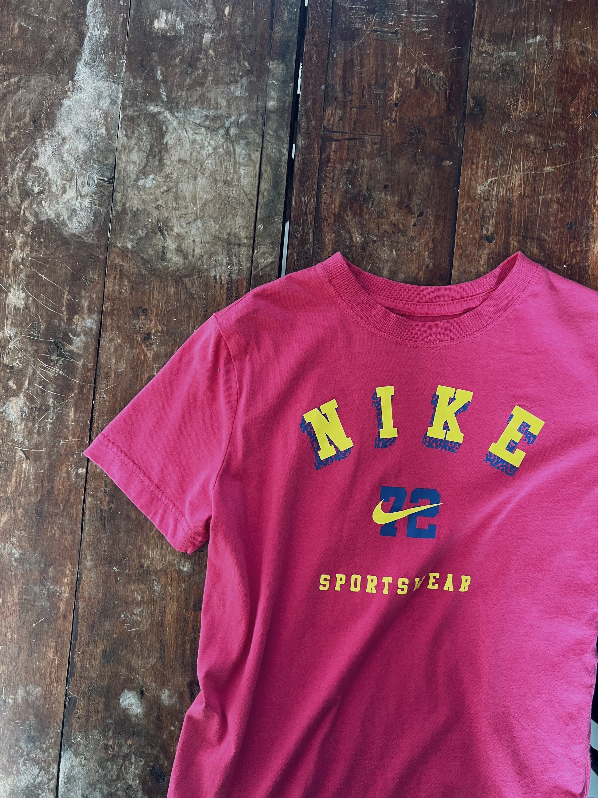 Awesome dark pink tshirt. It's Nike so it's cool enough. Soft. Unique print. Inside print label on back is damaged.