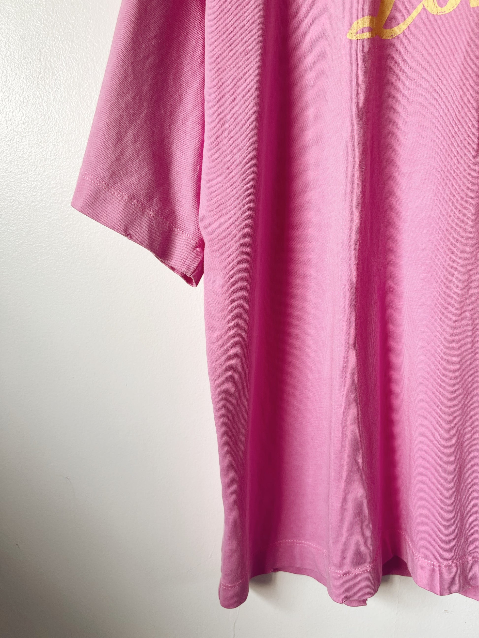 Cool tshirt. Pink. Oversized. Los Angeles print. Rip design on edges of hems. Teeny tiny marks at the back. Perfect with baggy jeans during lazy days.