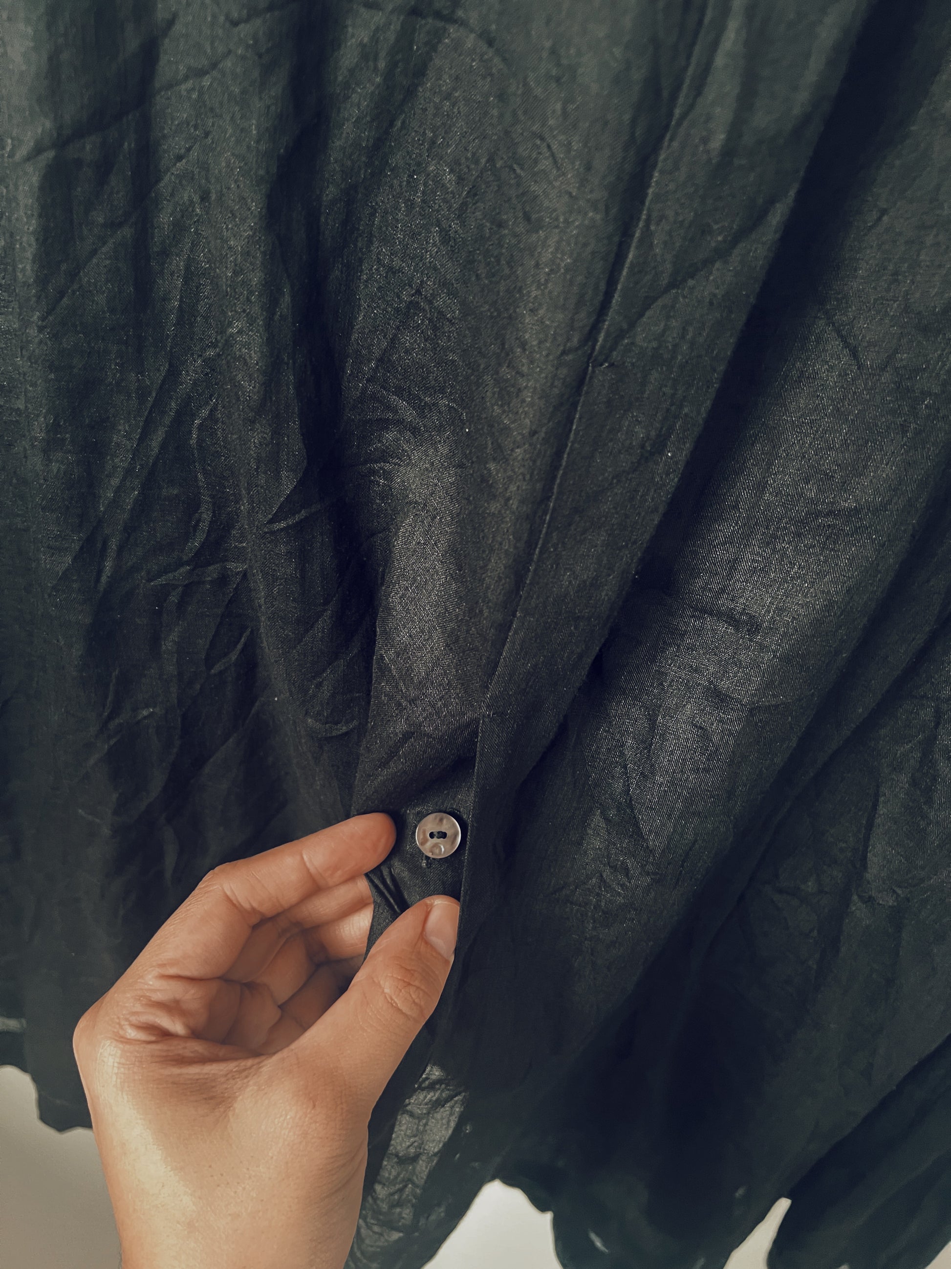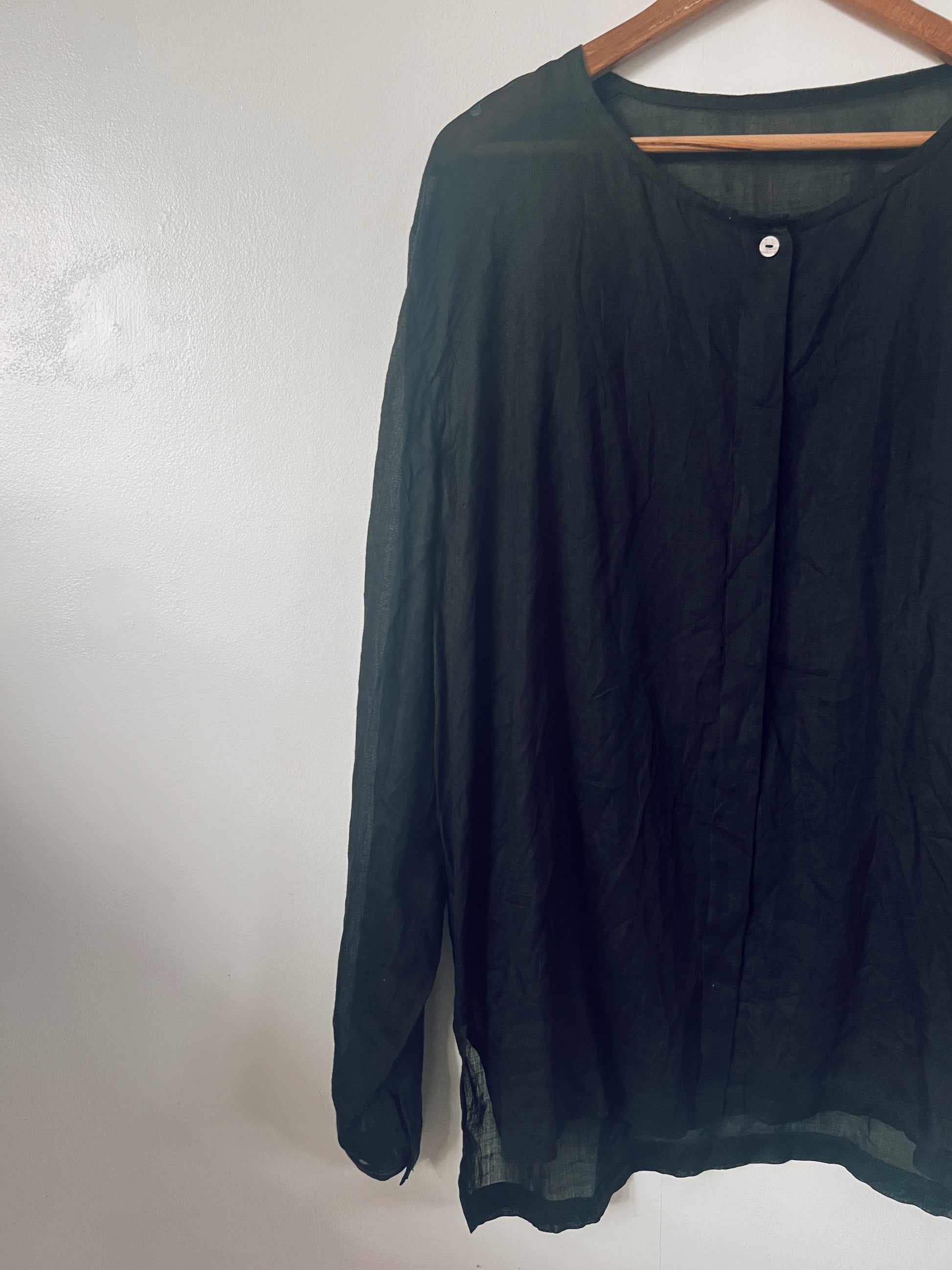 Simple, minimal blouse. See through. Lightweight. Button up. Slits on sides. Perfect as a cover up or to wear on top of sleeveless tops- then jeans. So chic.