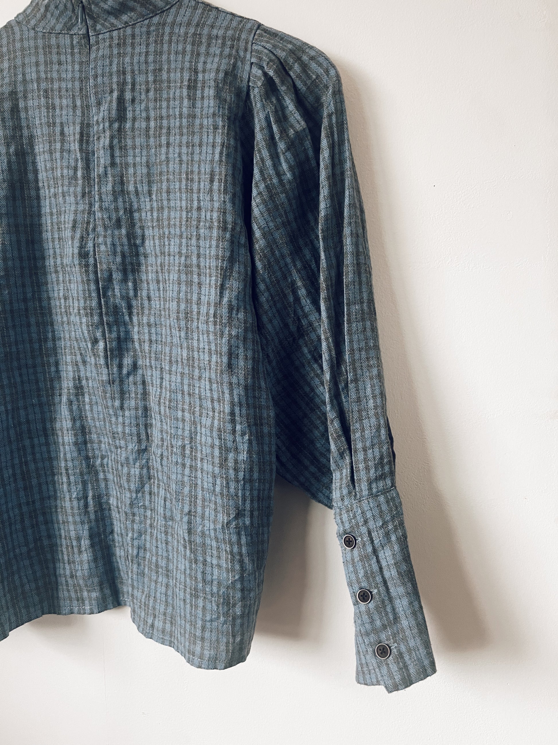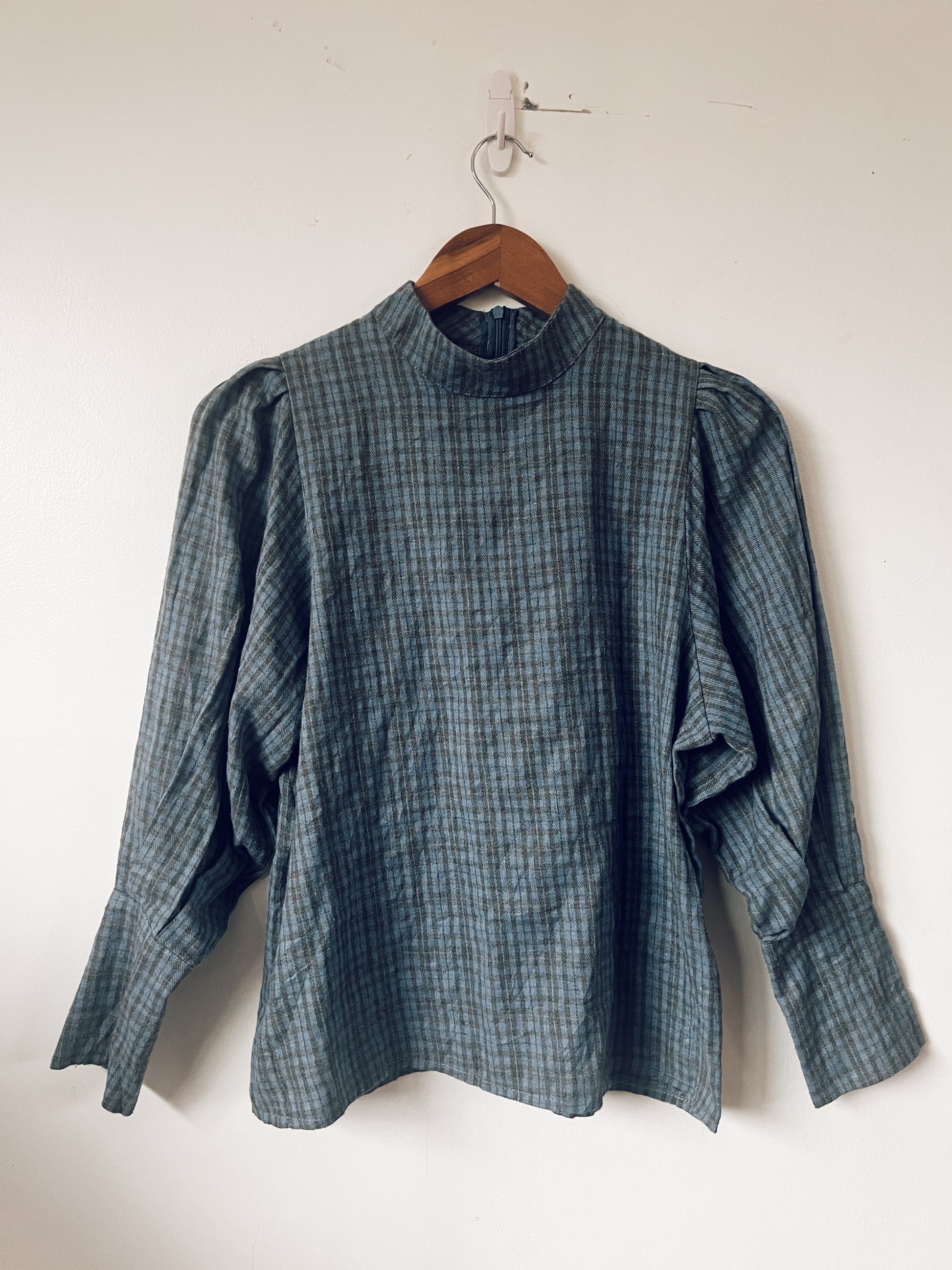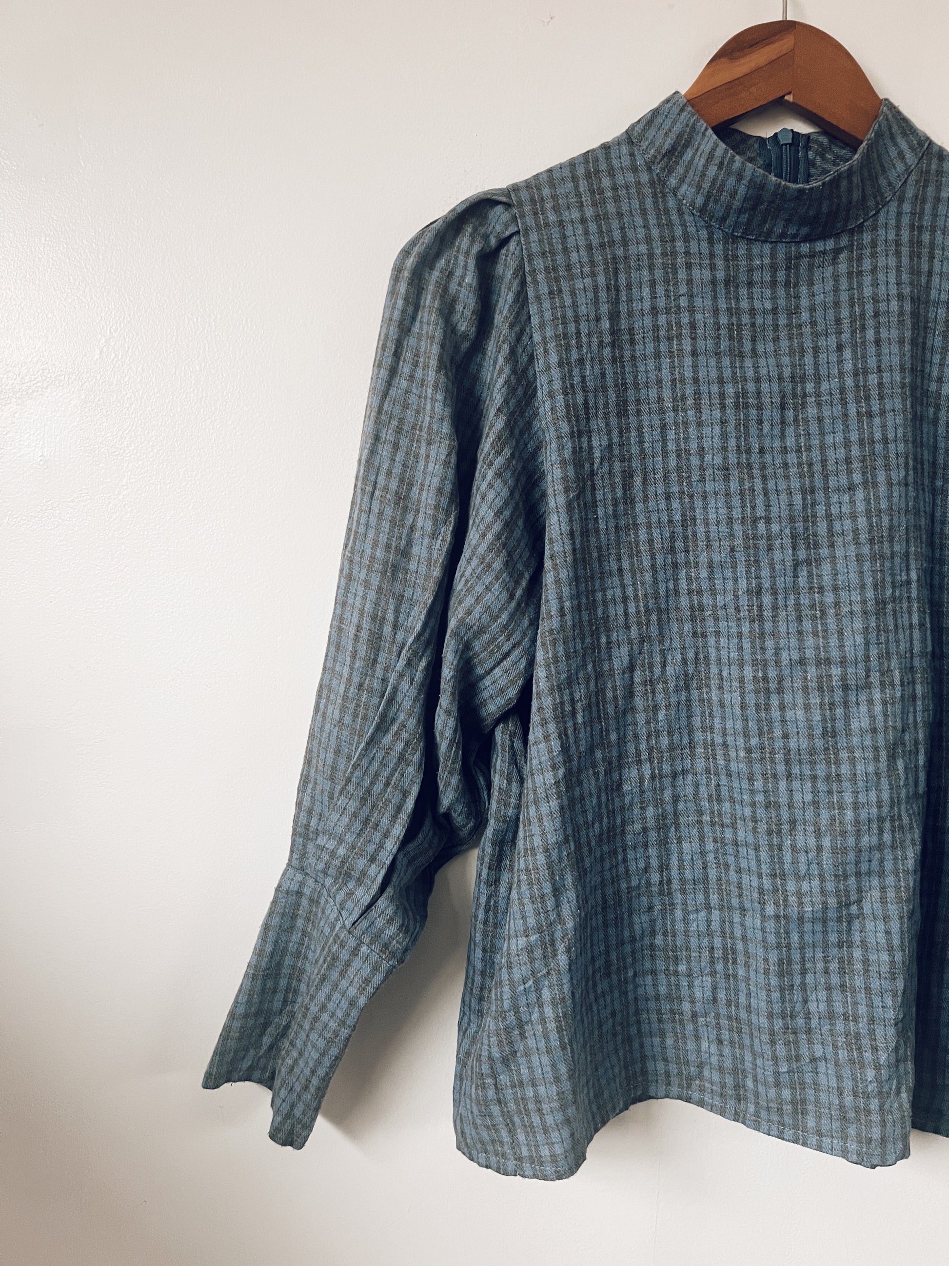 Blue and black print. Lighweight. A bit of a poof on shoulders. Three button closure on sleeve. Zipper closure on back. High neck. Amazing with high waist bottoms.