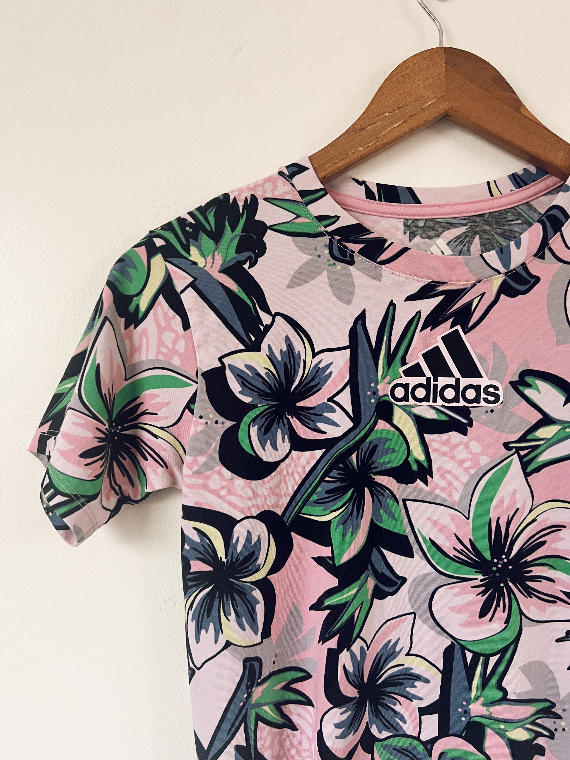 One-of-a-kind Adidas tshirt. Floral. Pink and green. Super soft. Cool hem design, see photos.