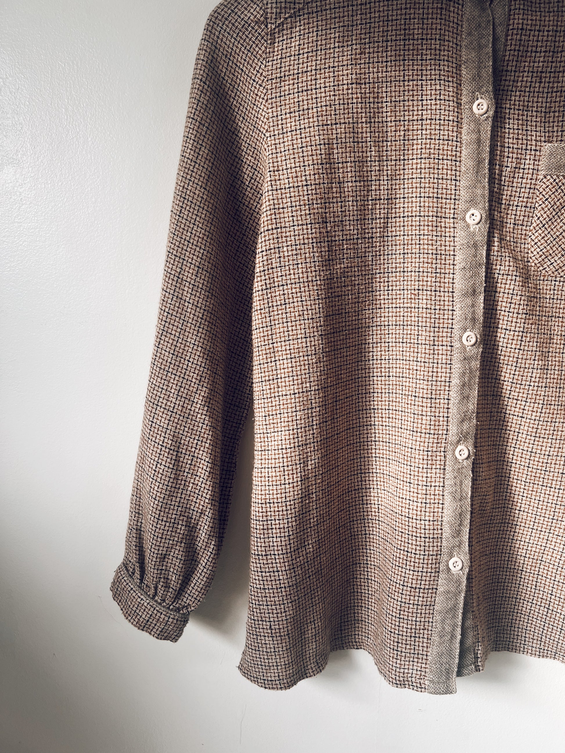 Dark academia vibes blouse. Tweed design/pattern. Button up. Small pocket on front. Slits on sides. Light material. Looks great with high waist jeans with Nietzsche in hand.