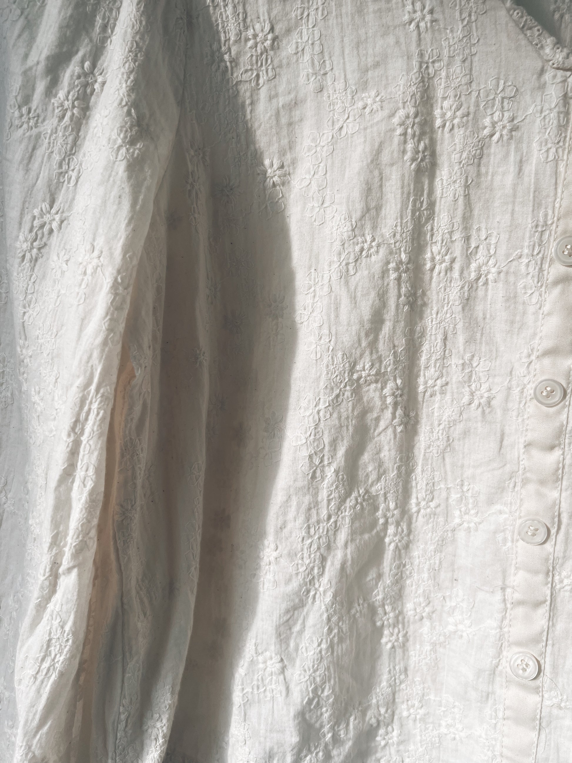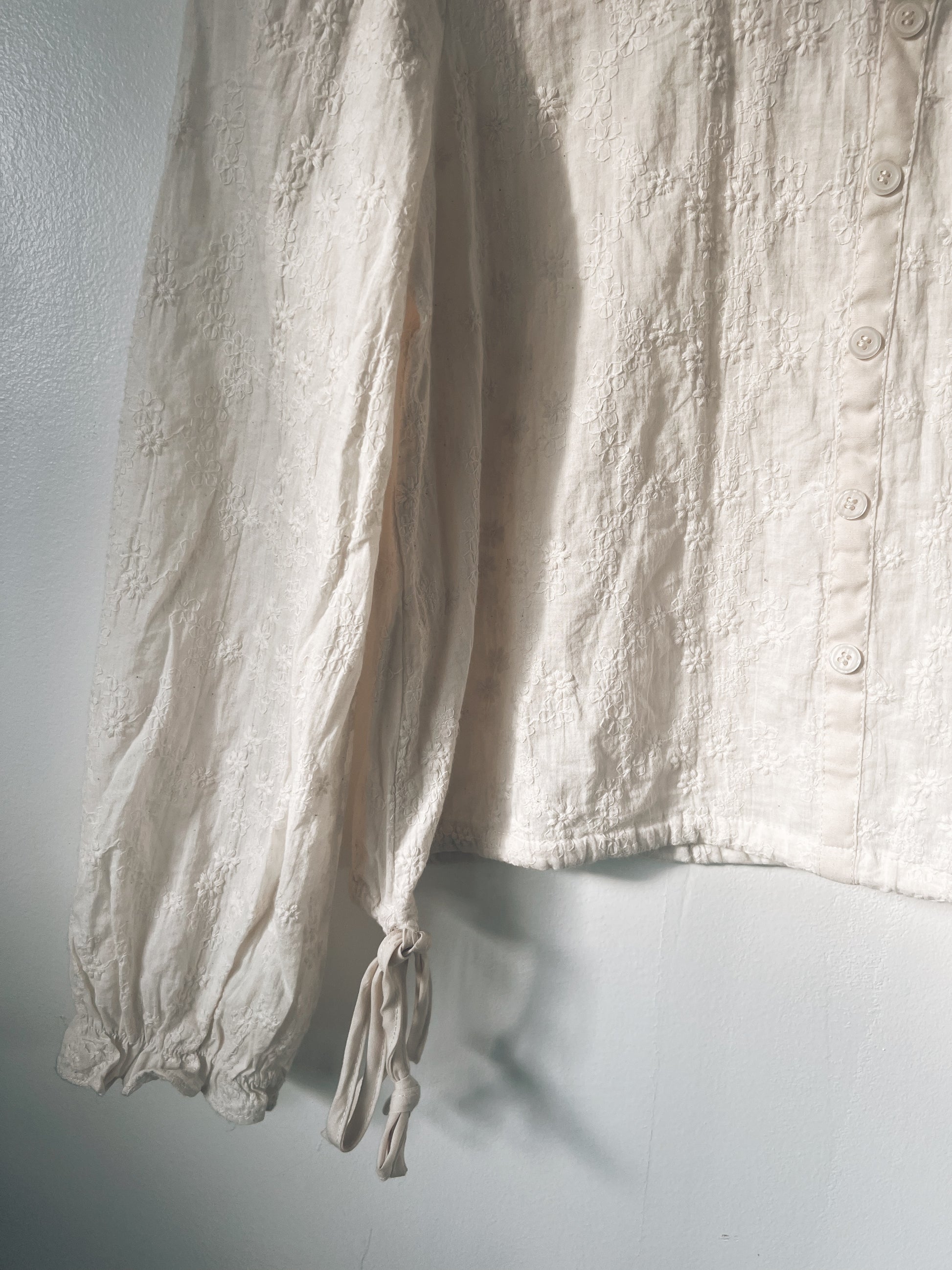 Such a beauty! Light cream in colour. Floral embroidery. Buttons are only a design. Hem can be tightened with a ribbon. Lightweight. Amazing with jeans- with any other bottoms actually.