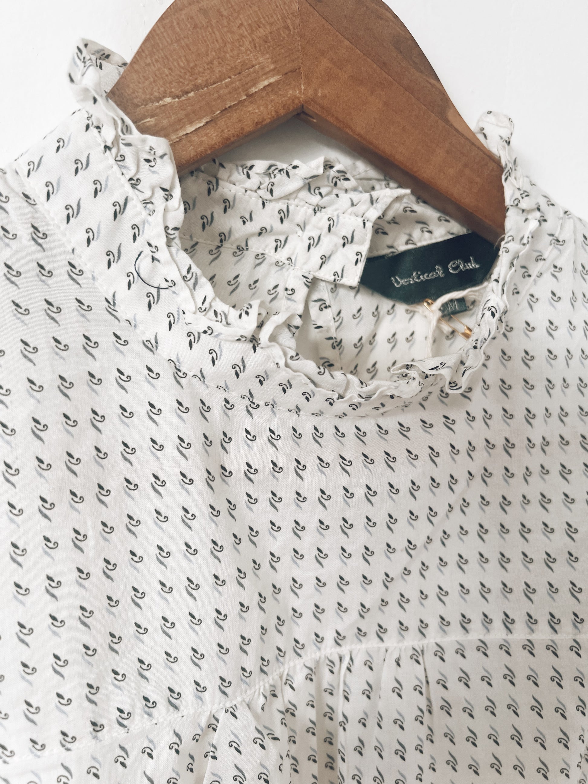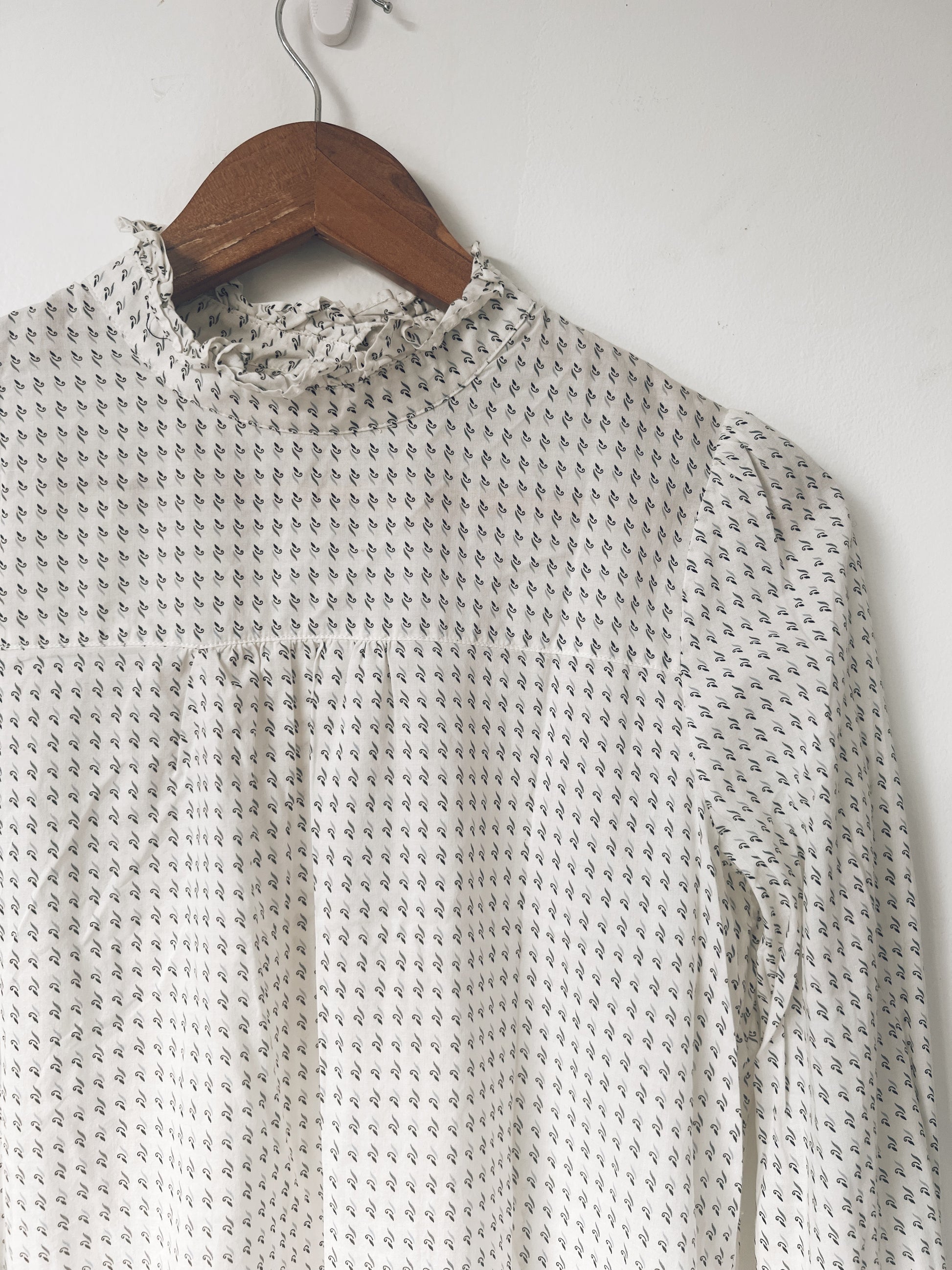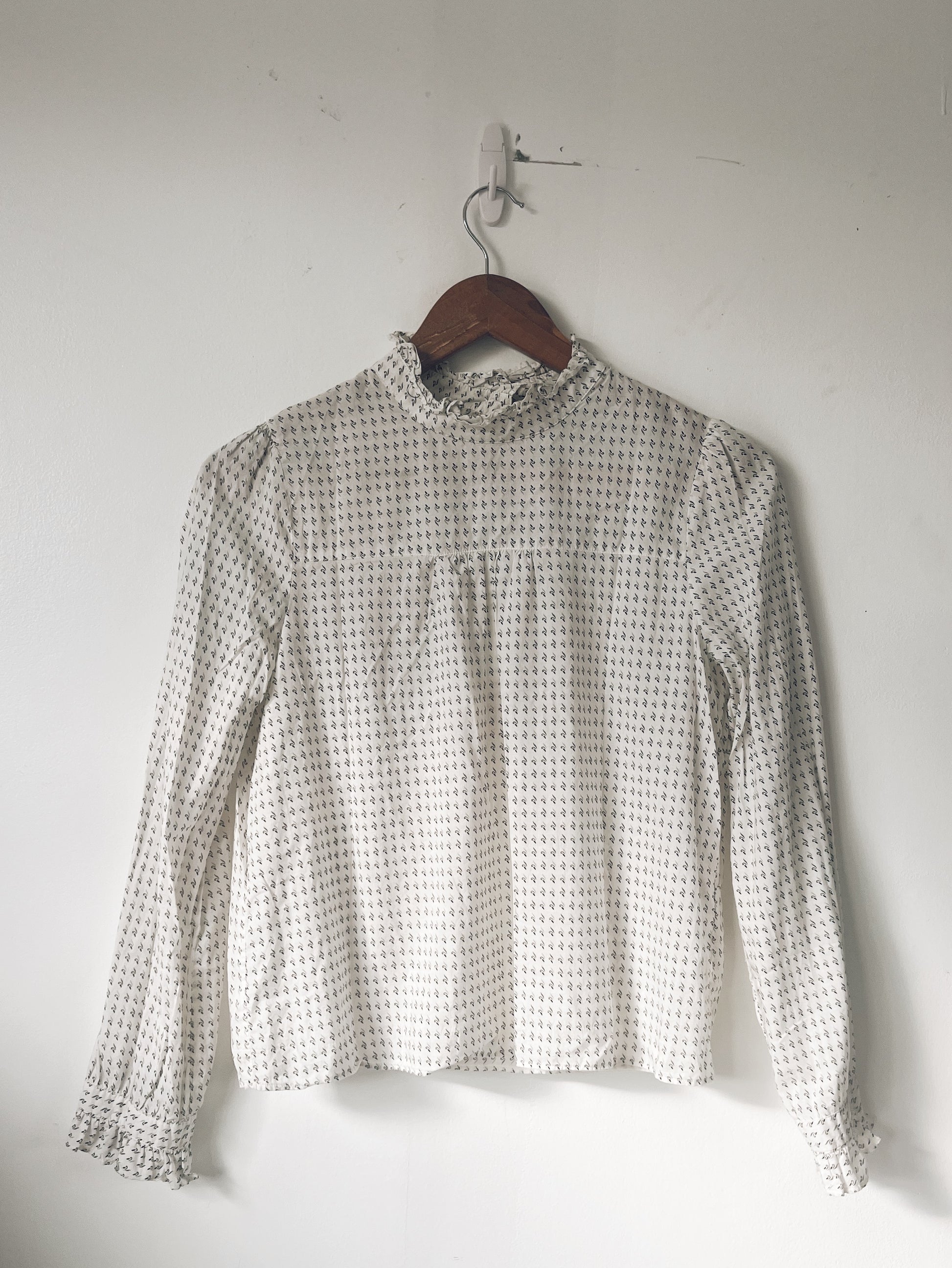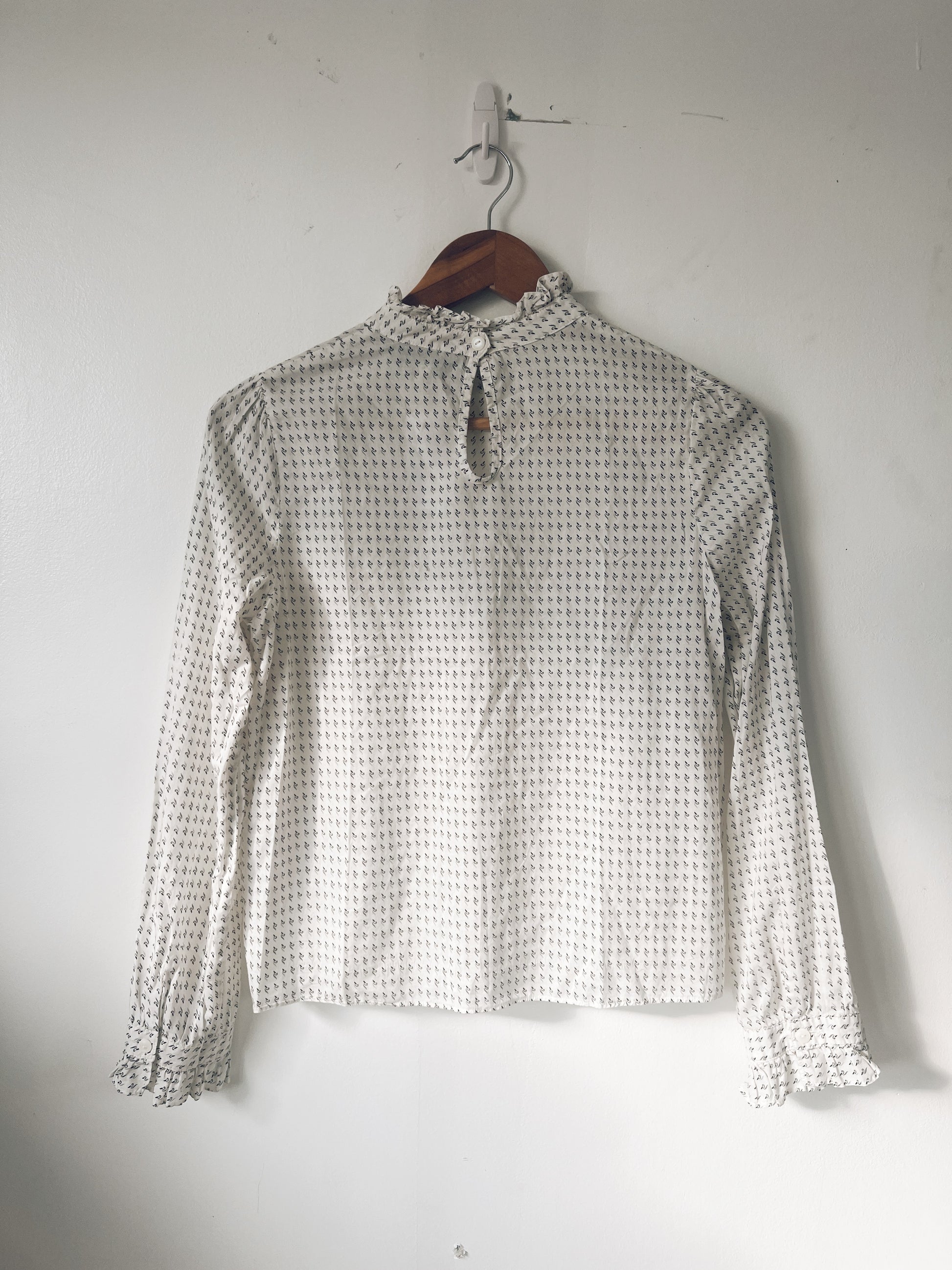 A darling blouse! Dainty, small prints all over. Ruffle on neck and sleeve ends. Button closure on the back of the neck and sleeve. Lightweight. Perfect blouse for casual or a polished look!