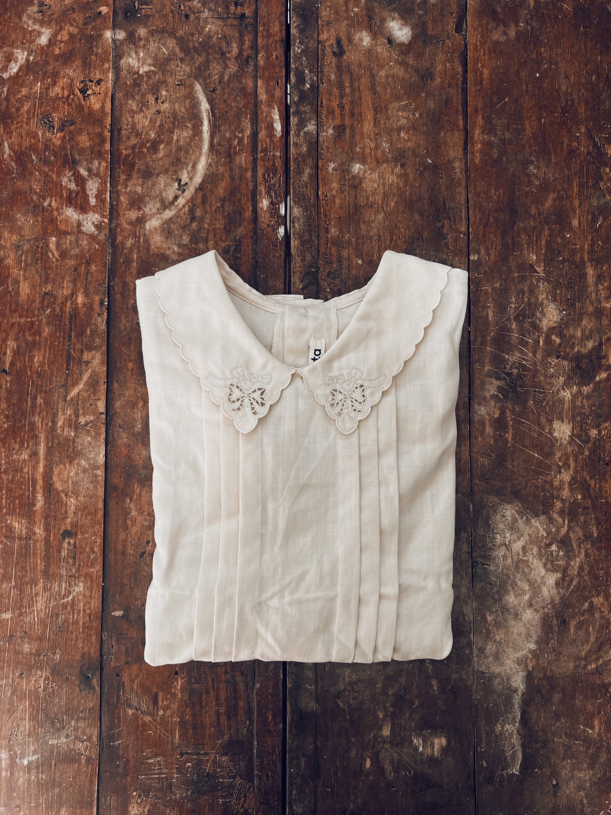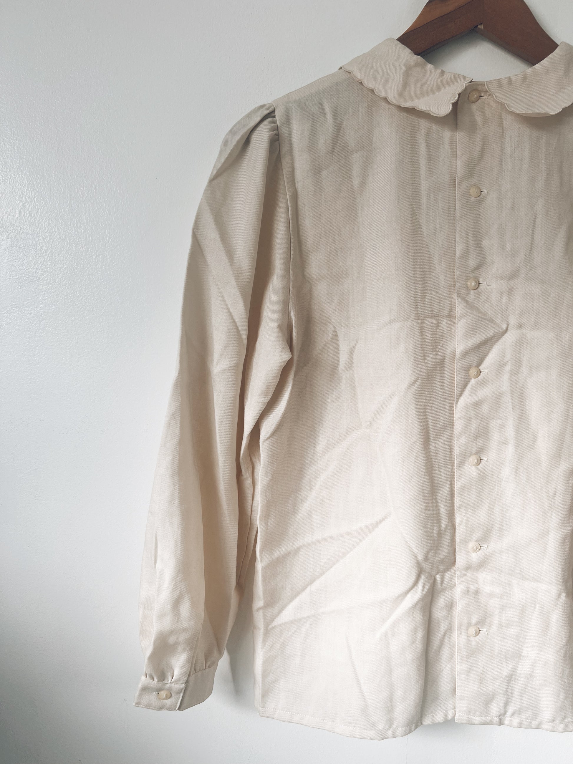 Super cute! Light brown- almost like a latte. Ribbon design collar with scalloped edges. Button closure at the back. Lightweight. Ah, can you imagine it with high waist jeans? High waist skirts? Trousers? Hair in a messy bun? With a Sylvia Plath book?