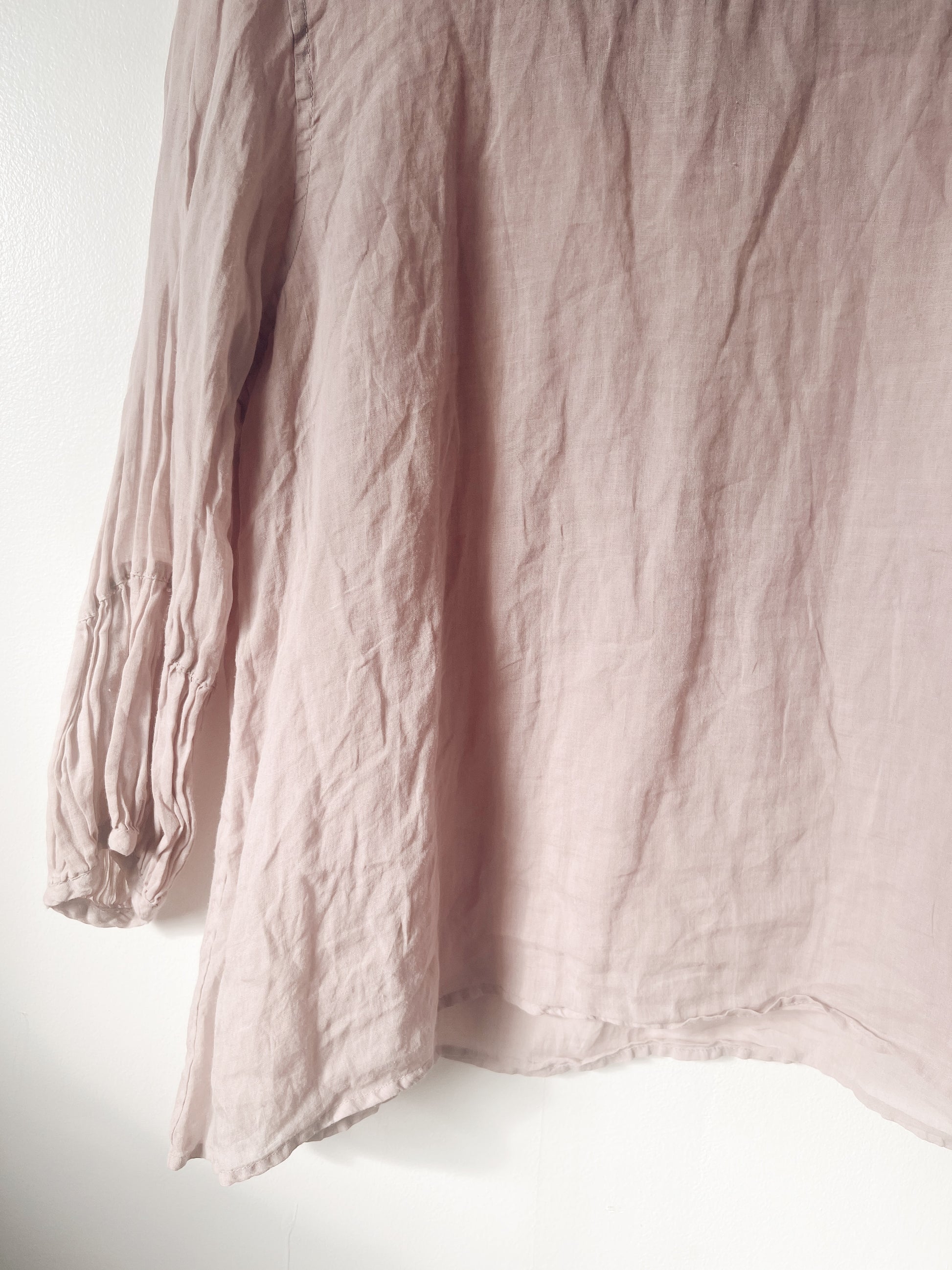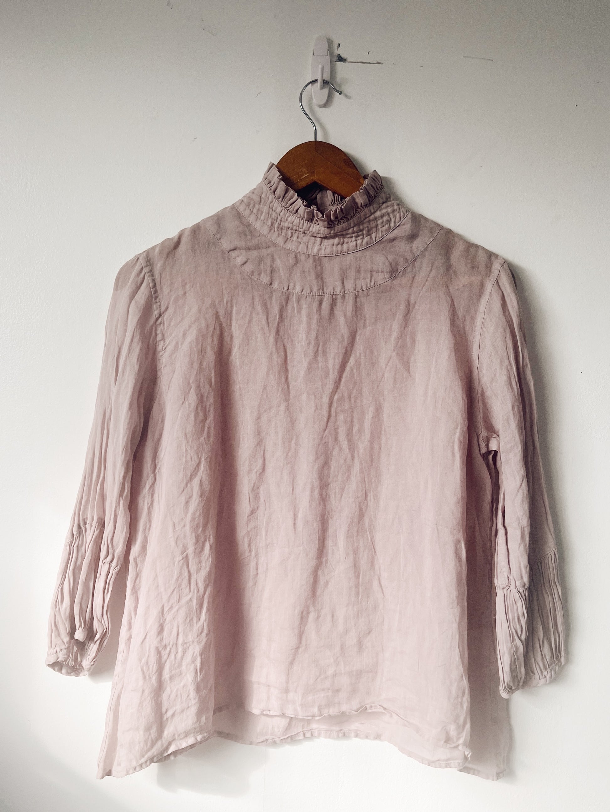 So dainty. Muted lilac in colour - as if pink and purple got together. Super lightweight, see through. High collar with ruffle. Pleated on lower sleeve. Two button closure at back of neck. Looks amazing with anything but best with high waist skirt.