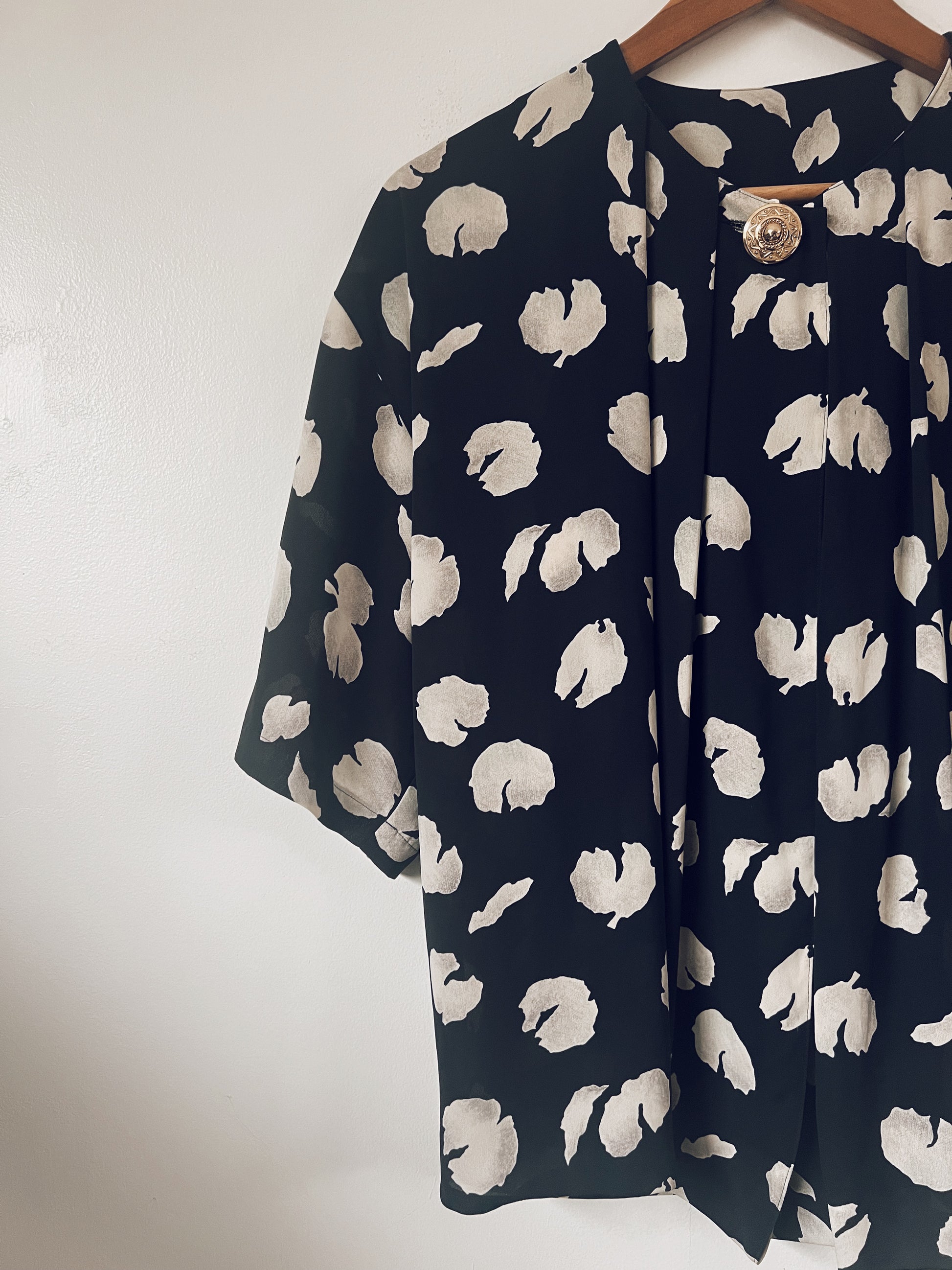 A cool blouse! Abstract white prints all over. Gold button. Flowy. Teeny tiny red stain, see last photo. Ah, you might be thinking- how to wear it? Tuck in a black tank top inside a pair of jeans or shorts then put this on top. Better if bottoms have raw edgest/ripped. Indie vibes.Ā