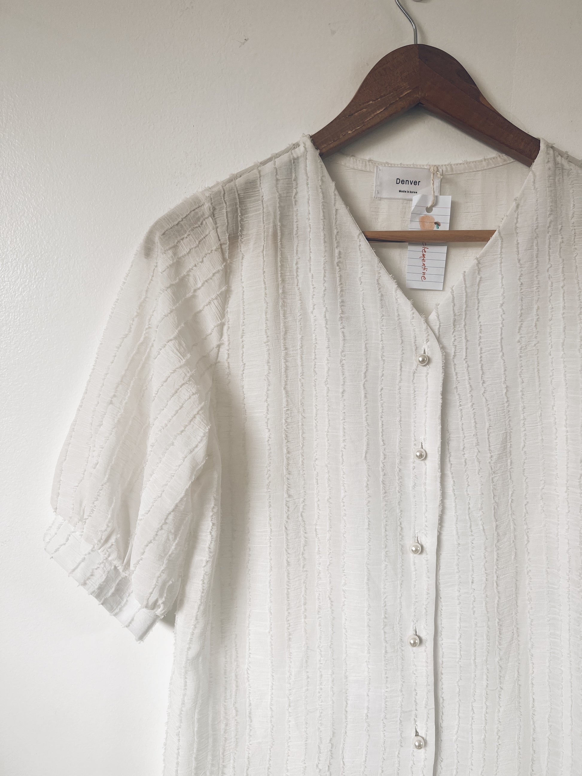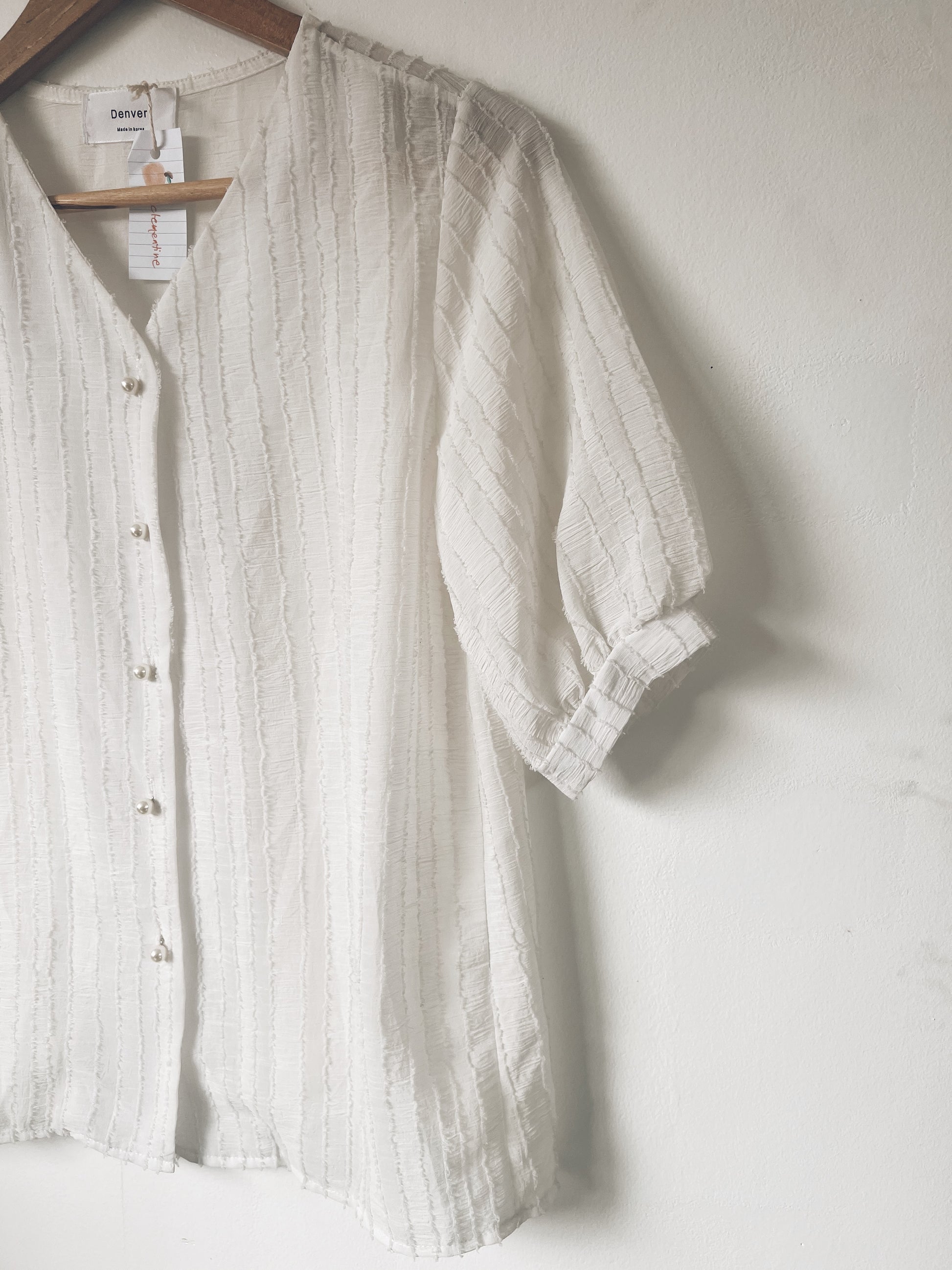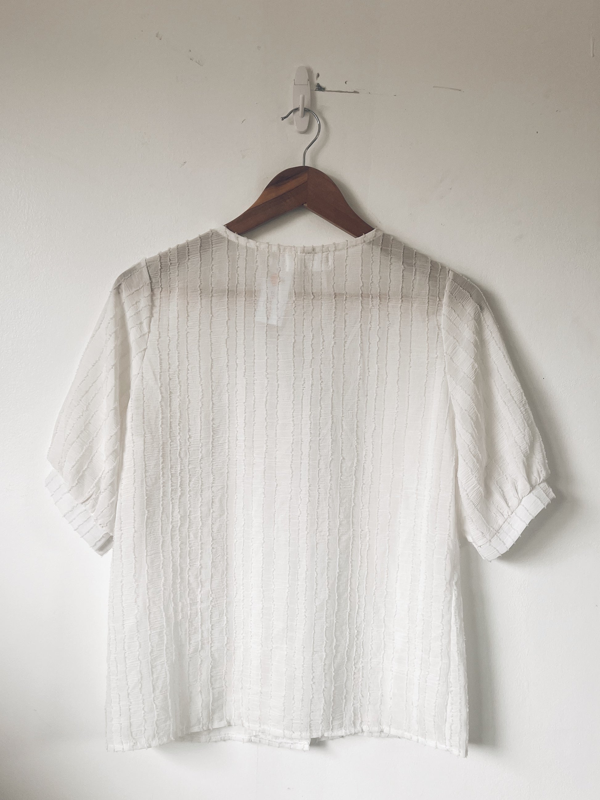 Your new go-to white blouse that goes with anything. Textured design. Pearl buttons. V neck. See through - but worth it. Flowy. Softly puffed sleeves. Perfection.
