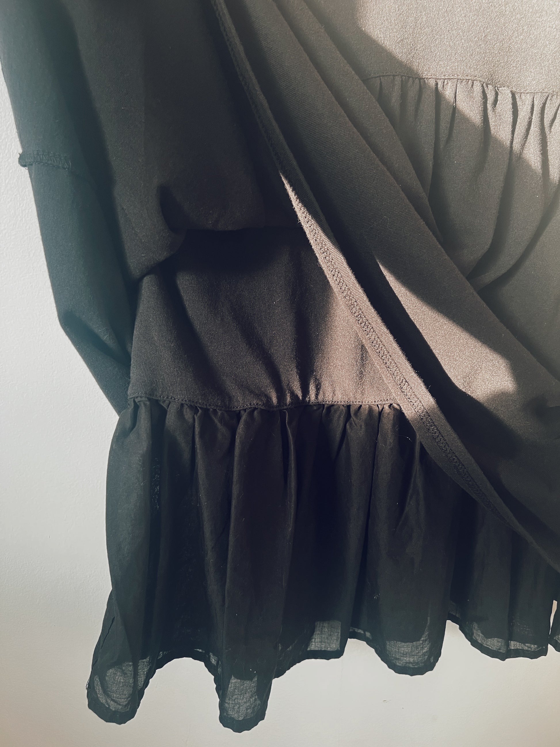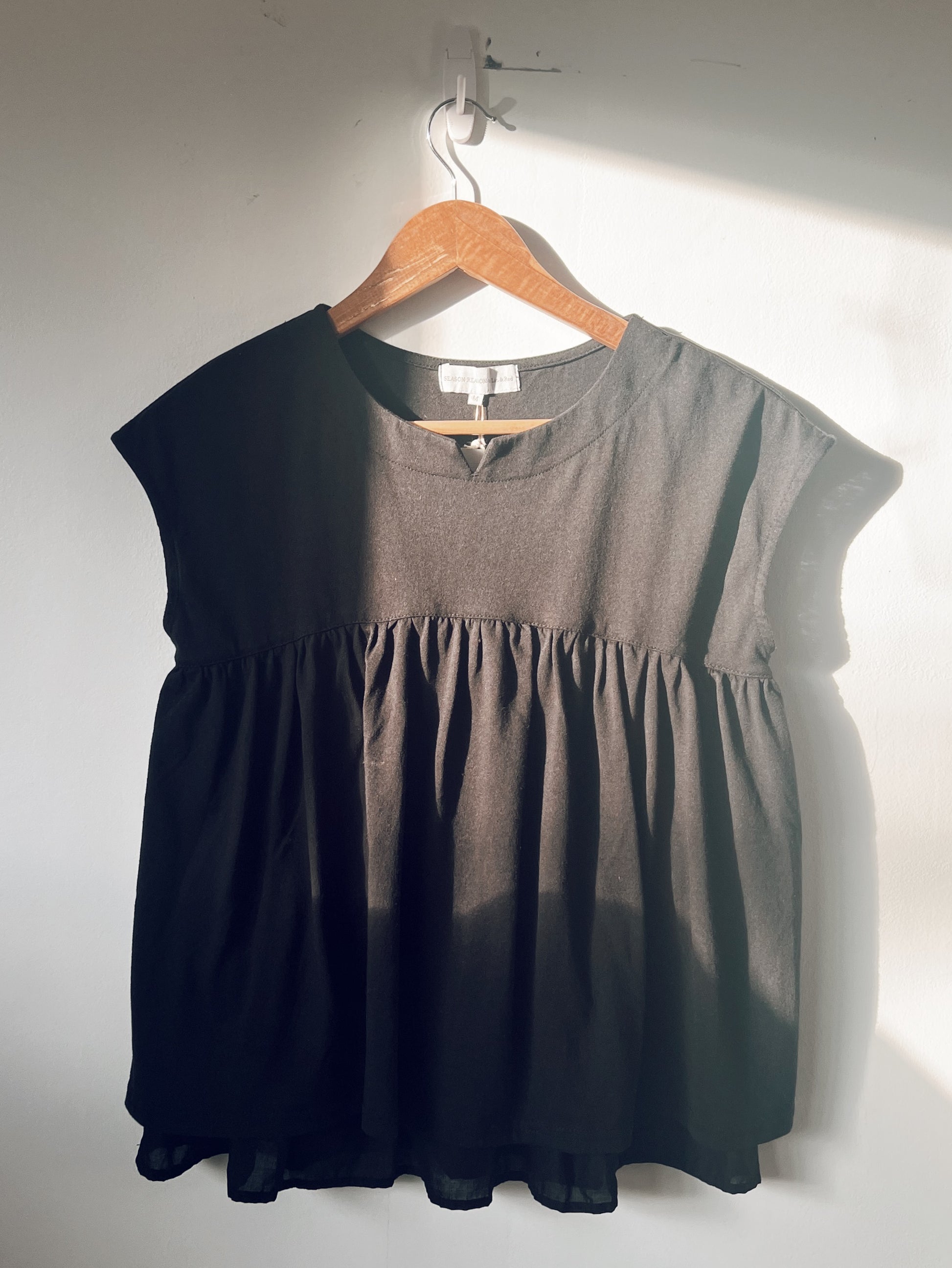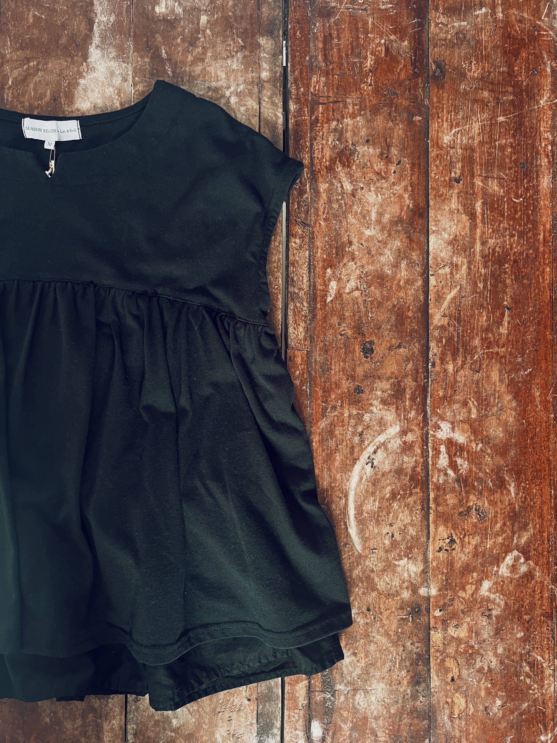 Suuuuper cute black top. Sleeveless. Flowy. Lower part has a second layer for extra poof. Well made. Easy wear top for lazy days- just put on baggy jeans!