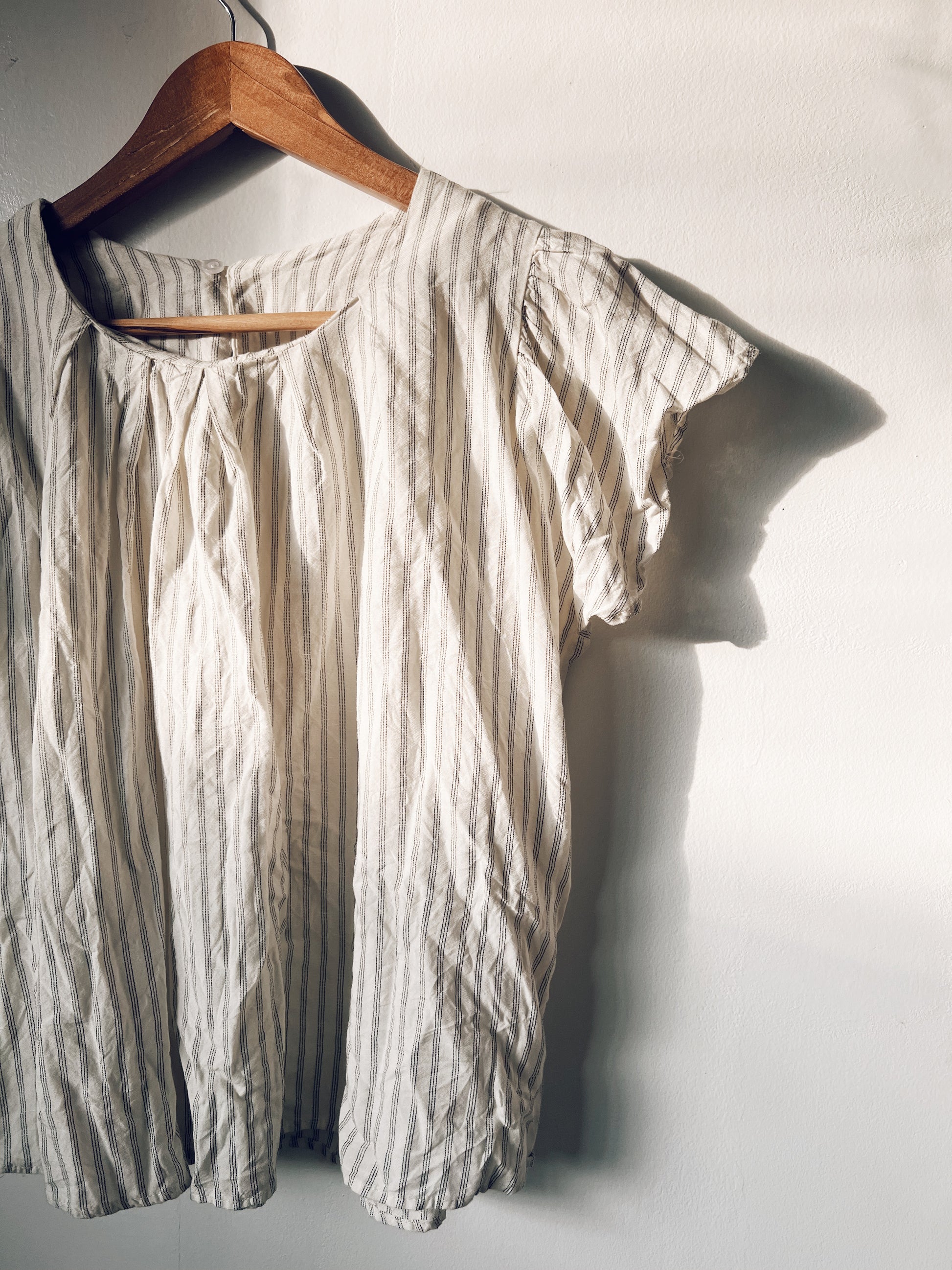 The most versatile blouse. White with stripes. Soft. Flutter sleeves. Button closure at the back of neck. Oversized/flowy fit. Perfect with jeans- baggy or skinny and your fave kili kili bag.