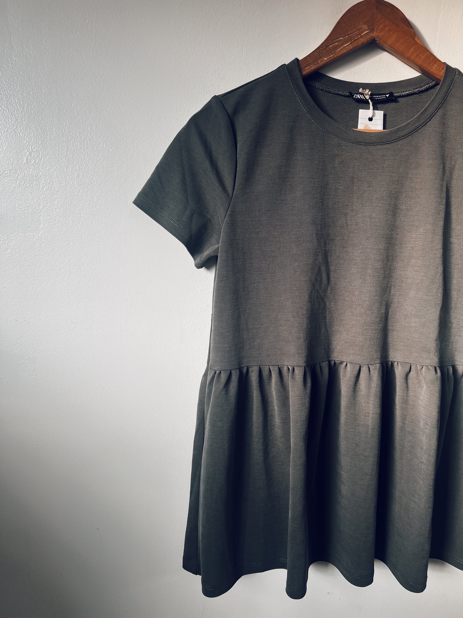 Minimal short sleeve top. Dark grey. Flowy. Lightweight. Super soft. Easy to wear from casual to office vibes.