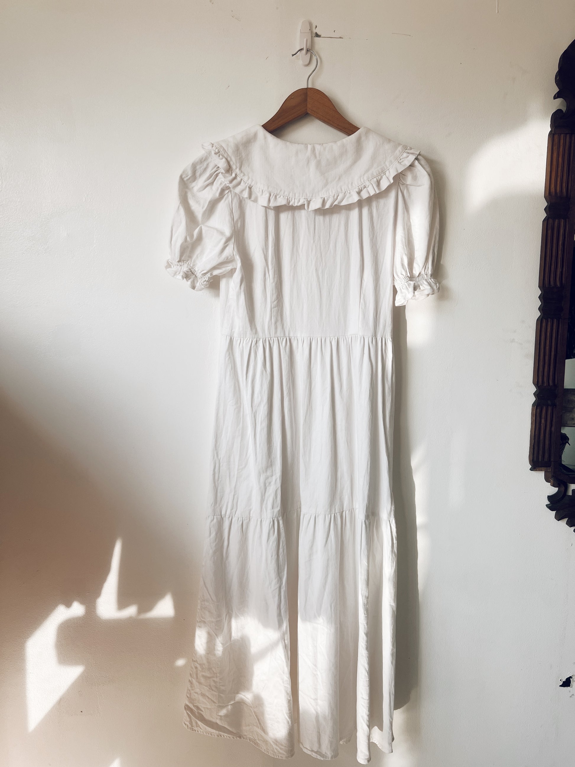 The most amazing dress. White. Button up. Ruffle sleeves. Big collar with embroidered design. Tiered bottom. Maxi. Great quality. Lovely birthday dress or just for everyday because why not.