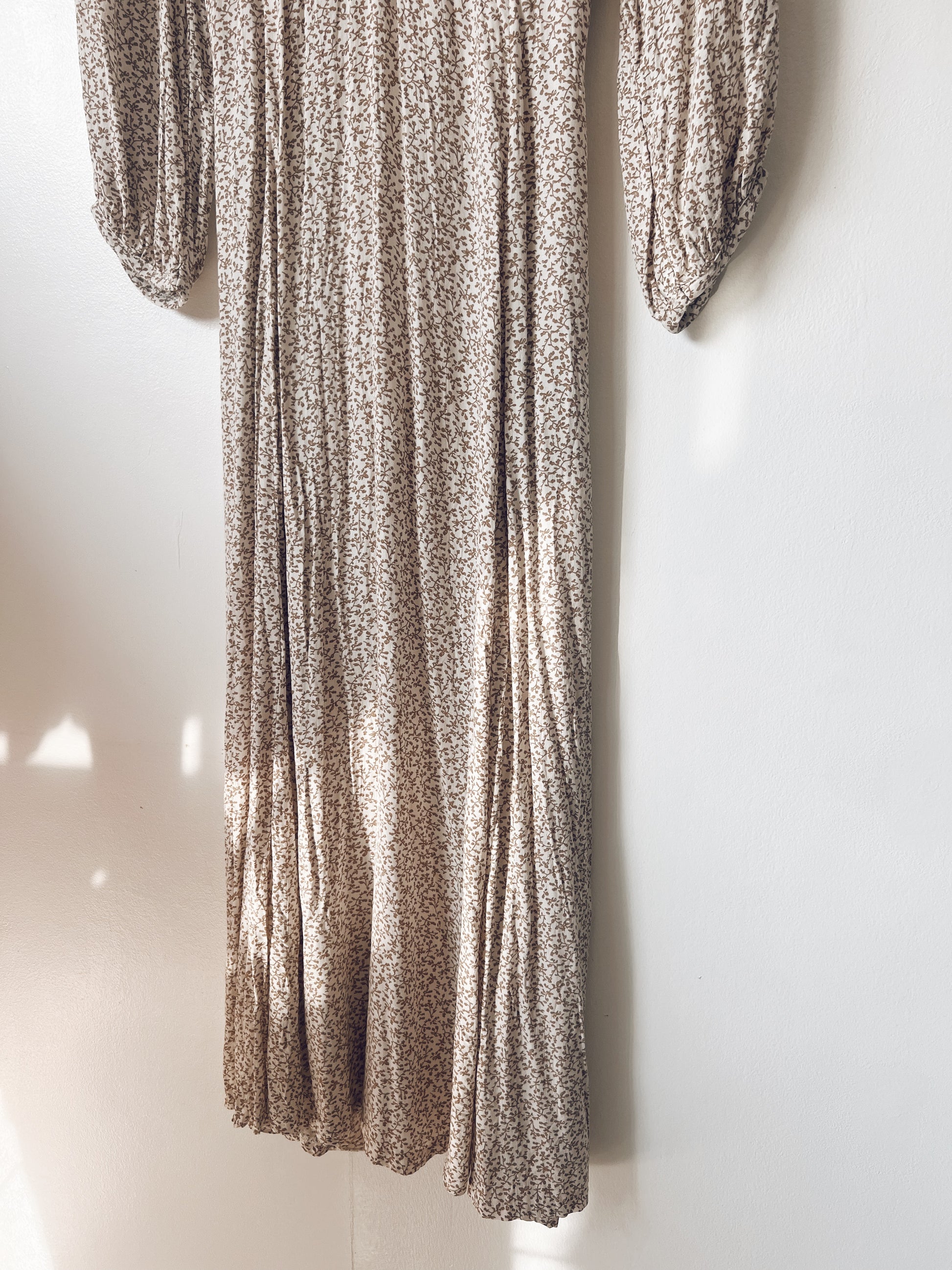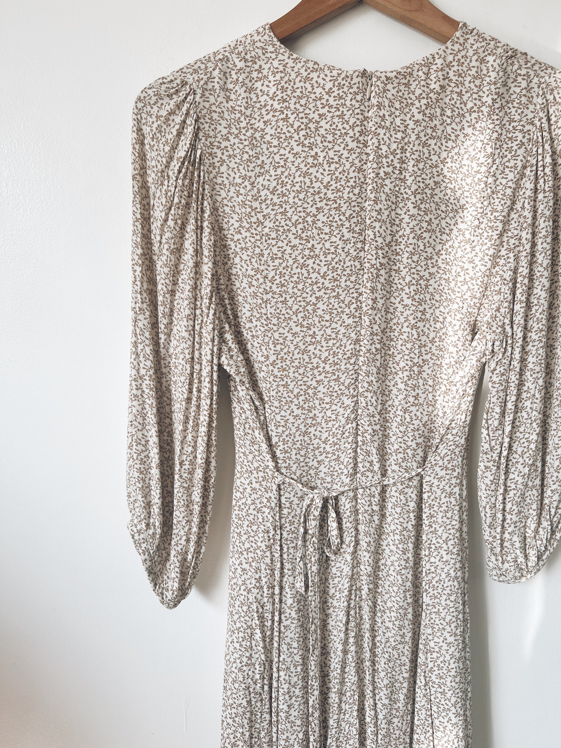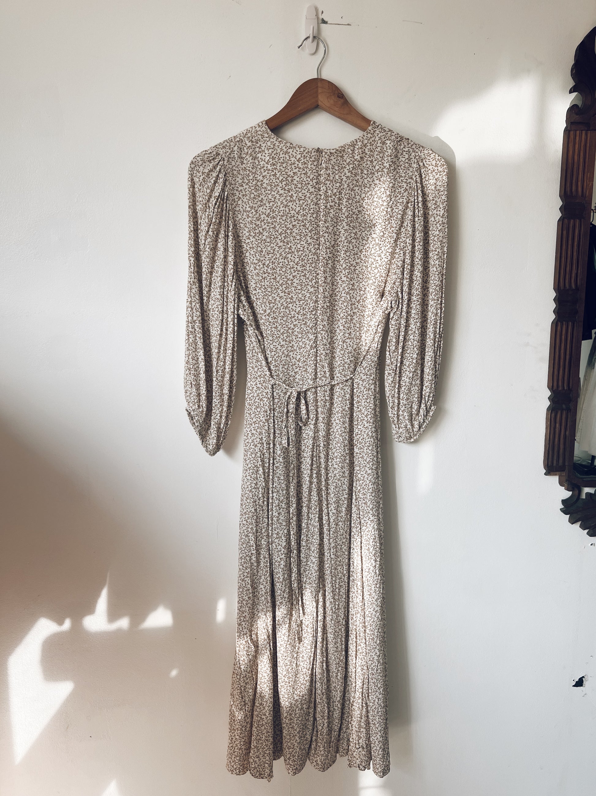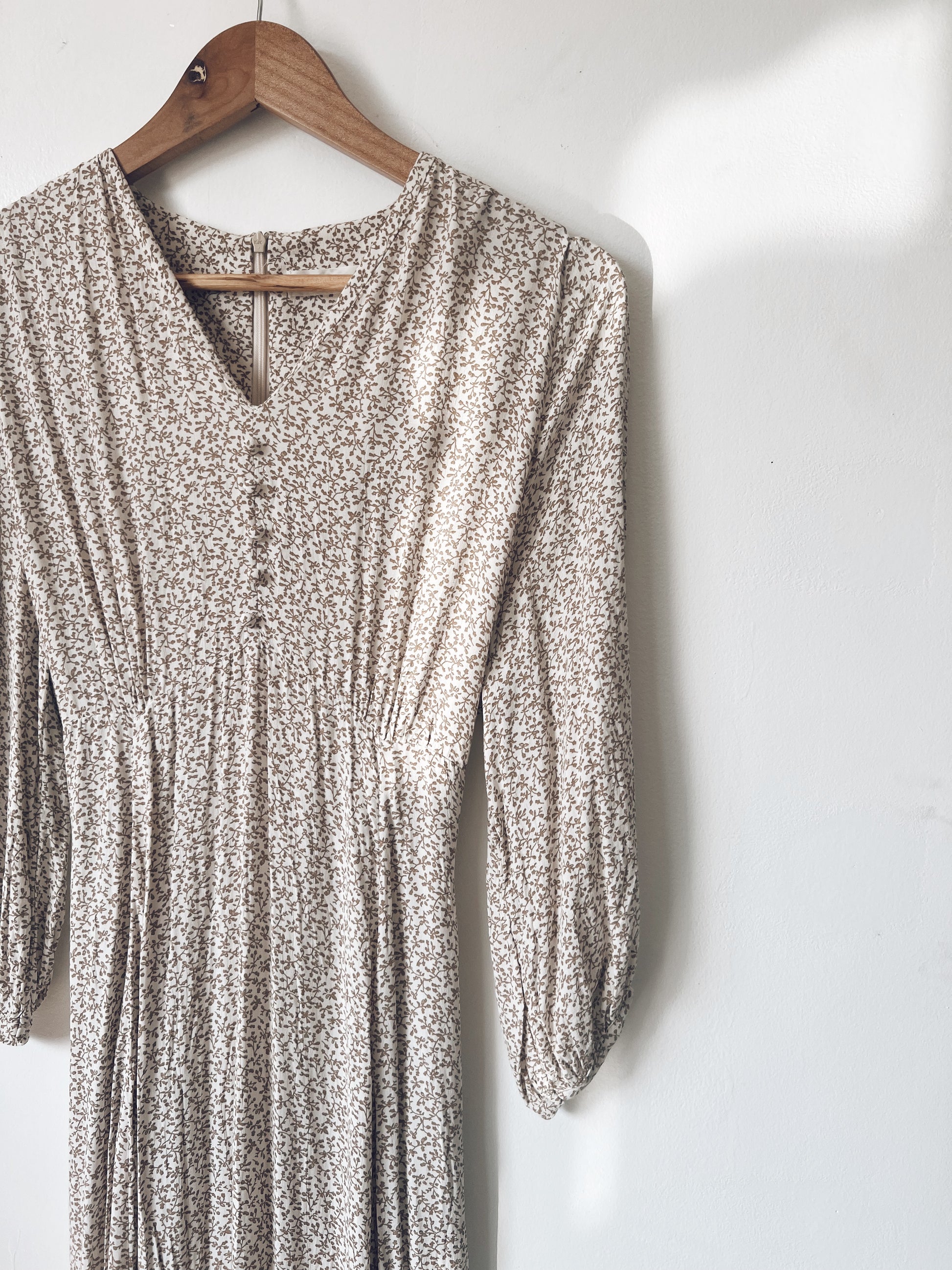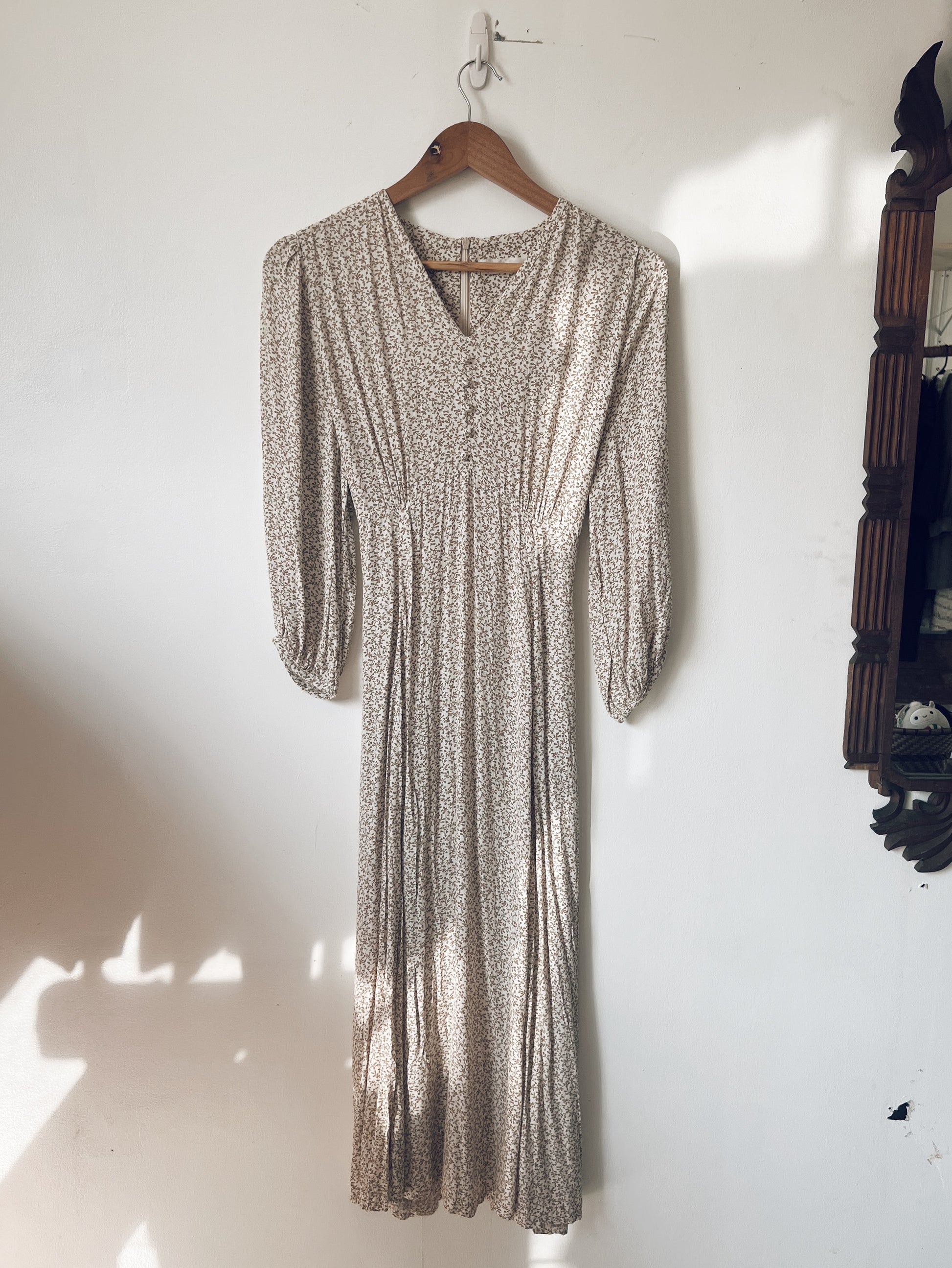 Such a romantic dress. Flowy. Dainty brown prints. Long sleeves. Zipper and ribbon closure at the back. Lightweight. Perfect for afternoons in the cafe, enjoying a slice of cake and spanish latté.