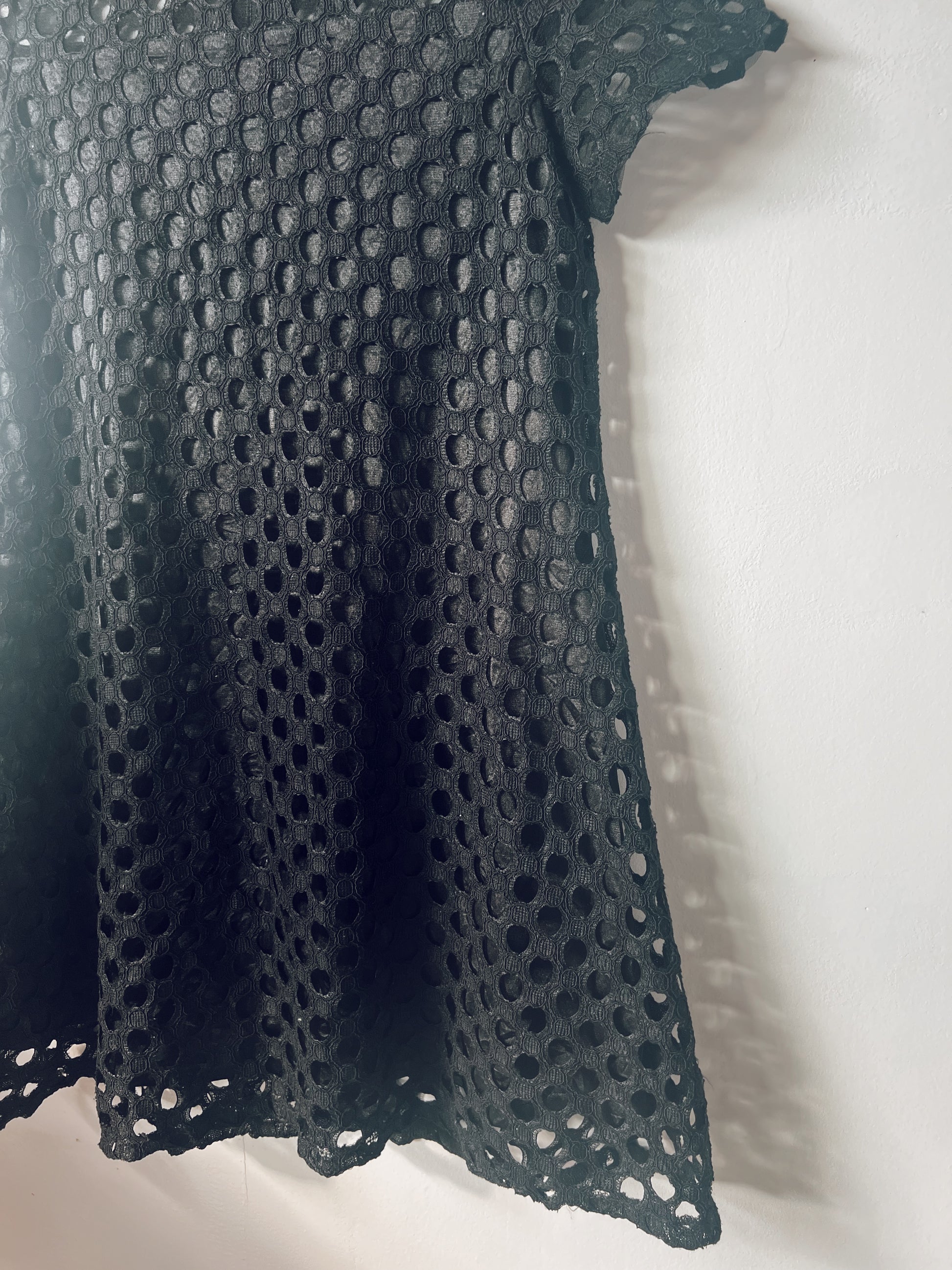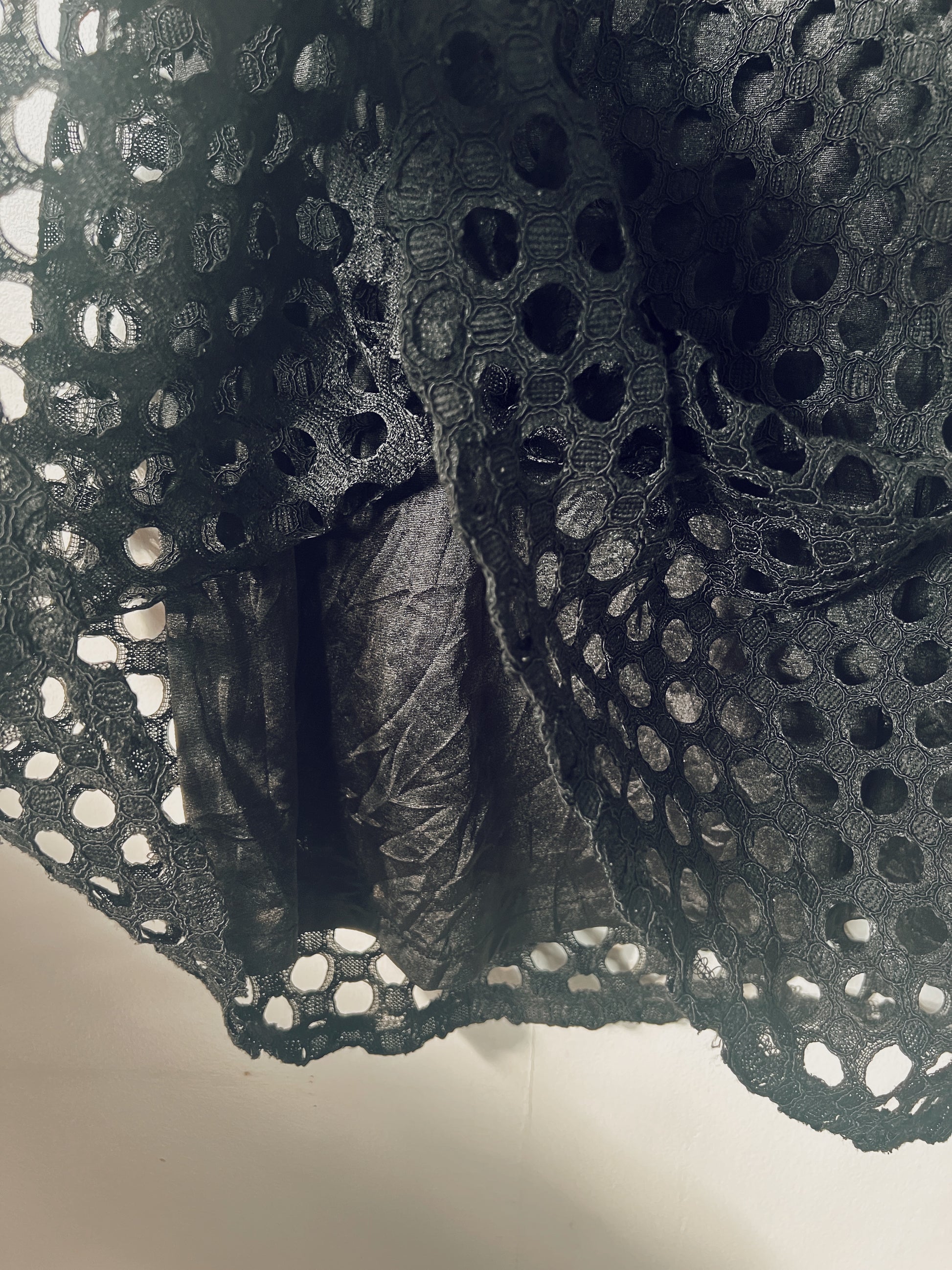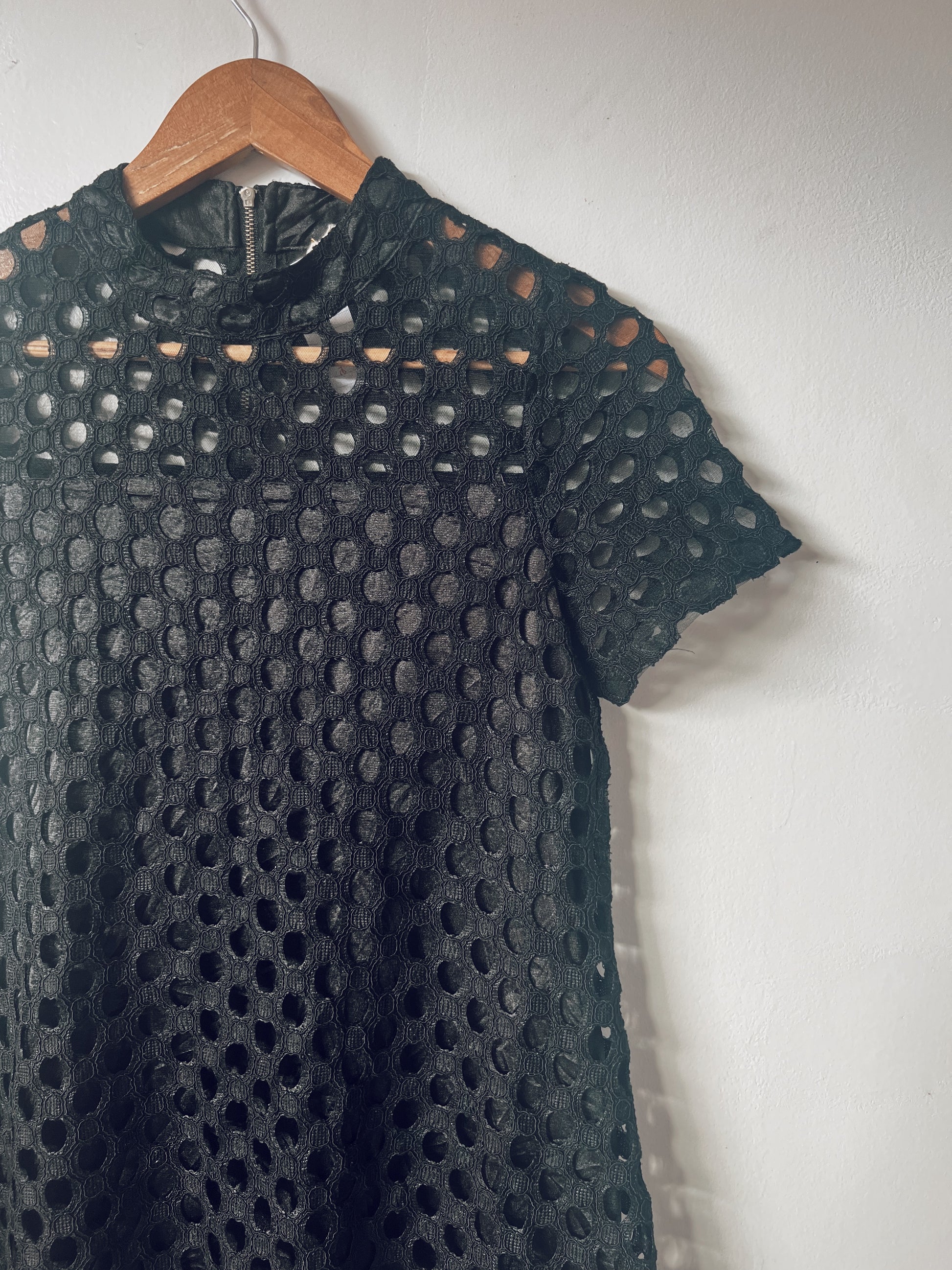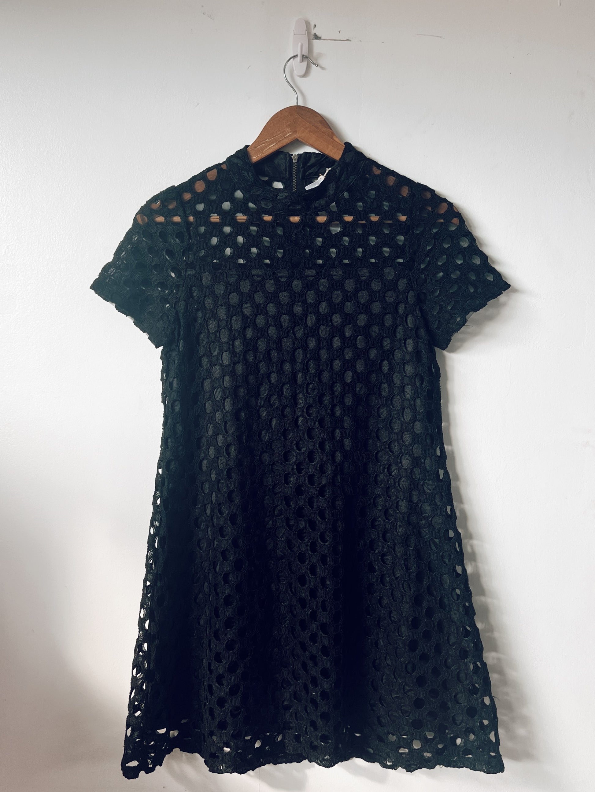A little black dress with a flair. Patterned lace. Lining inside. Zipper closure at the back. Lightweight. For office or for dinner with fwends.