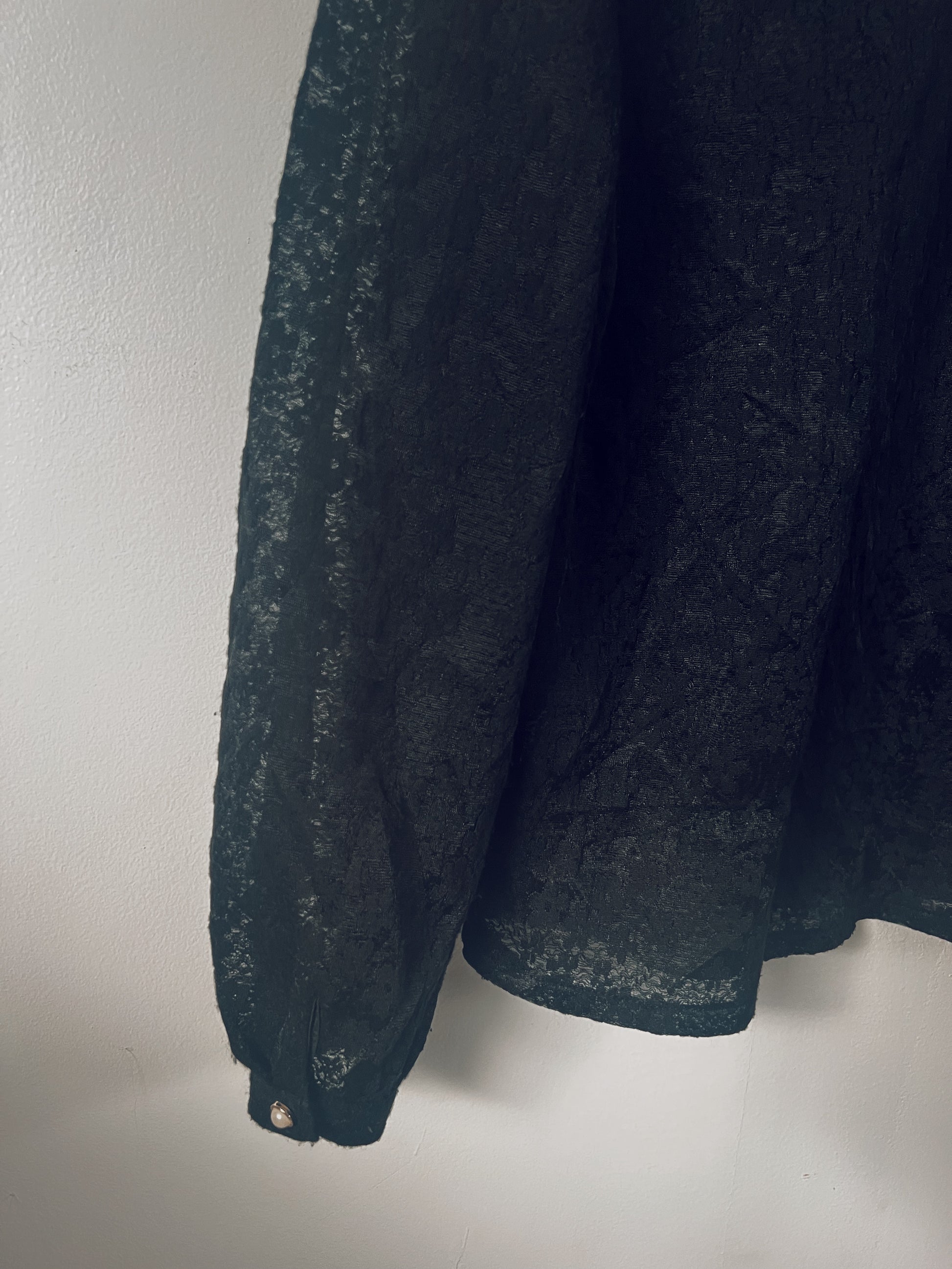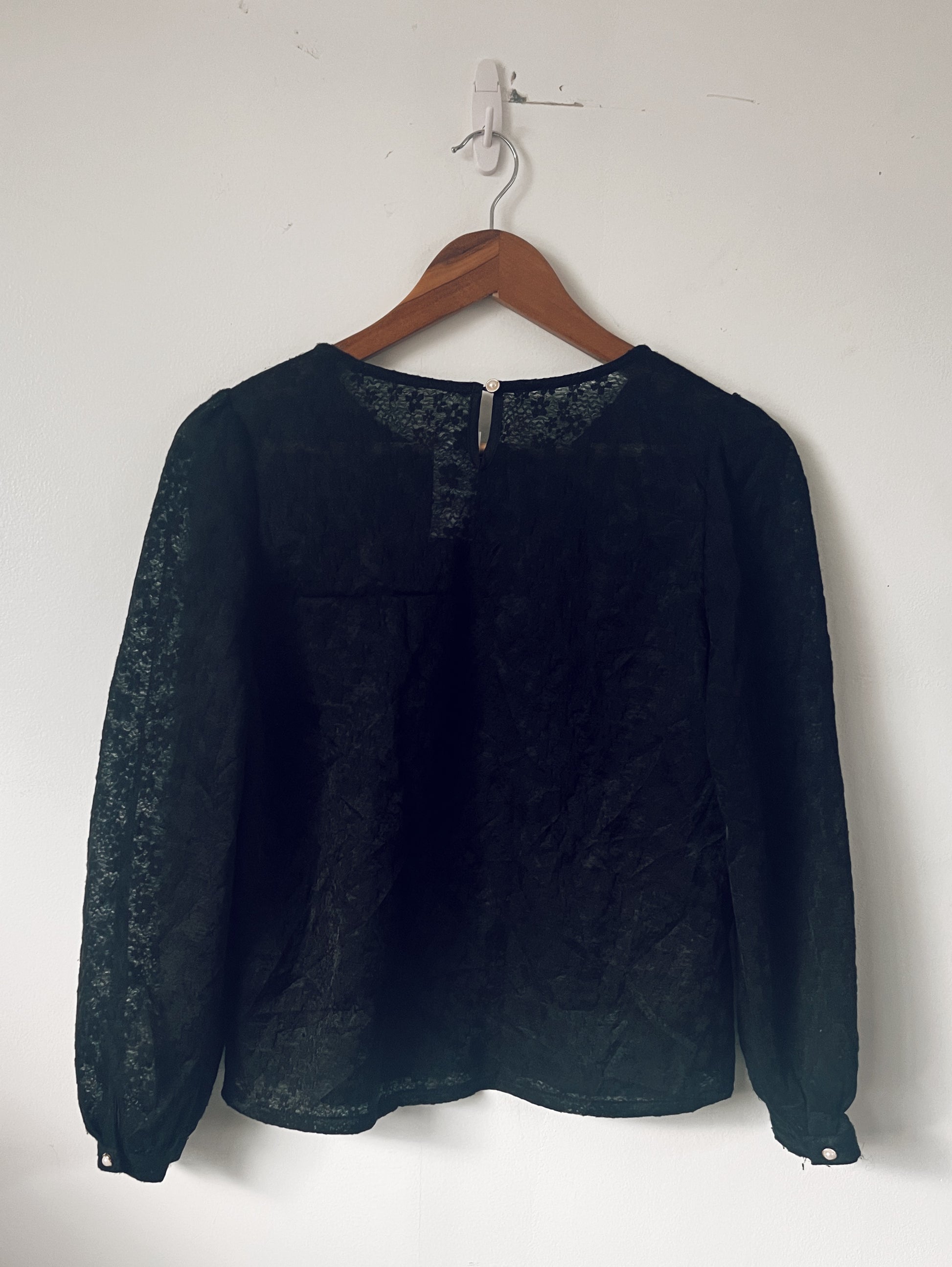 Cute and small floral patterns all over. Lightweight. See through. Pearl button on back of the neck and sleeves. Amazing with a cute high waist mini skirt and flats.