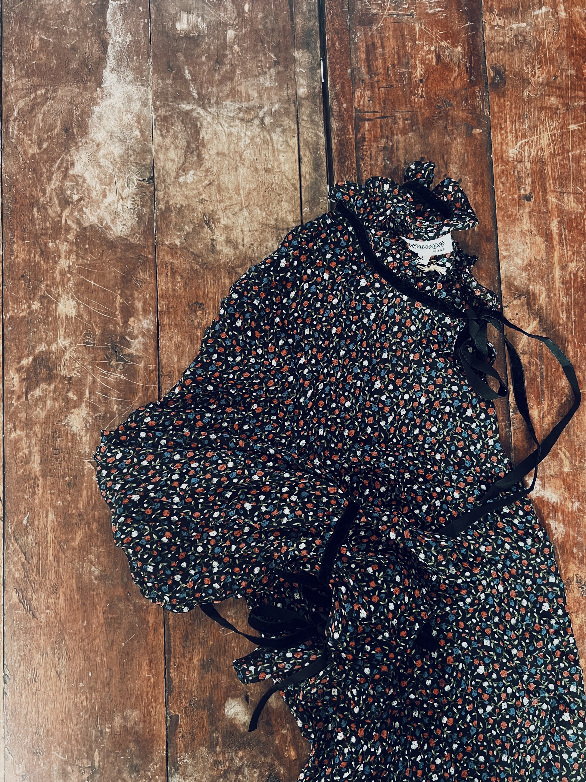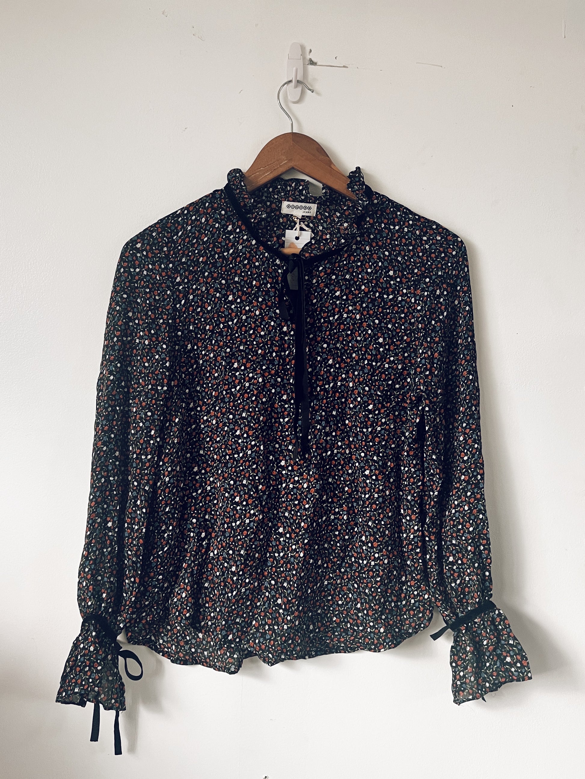 A pretty blouse! Feminine. Dainty floral prints. Velvet ribbon on neckline and sleeves. Ruffle on neck and sleeves. Flowy. Great with high waist pants, skirts. Match with your favorite heels or flats.