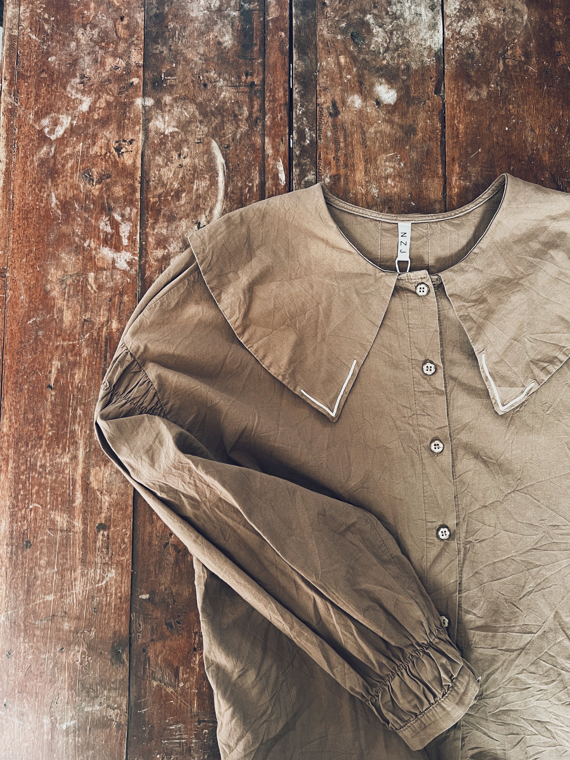 Adorable brown long sleeve blouse. Big round collar. Button up with flower design buttons. Ruched design on sleeves. Amazing as tucked in inside high waist jeans or shorts.