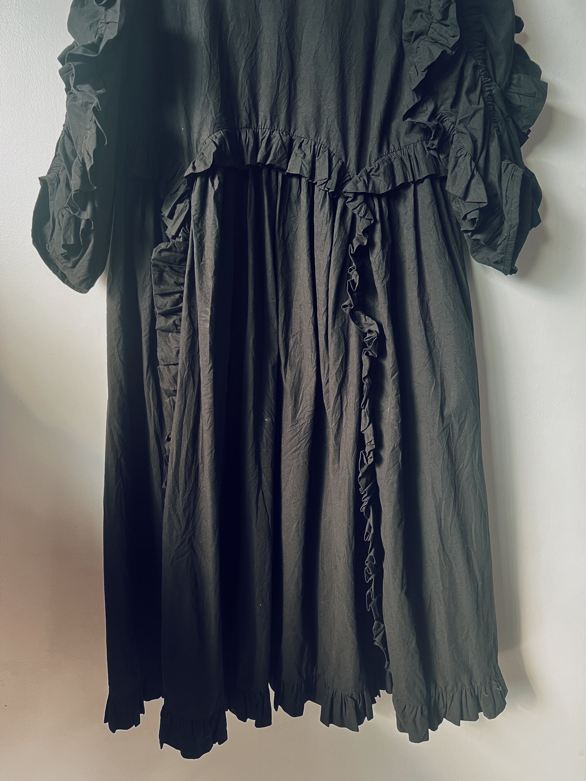 This is the most dramatic dress. Ruffles all over. Black. Ruched garter on sleeves. Great quality. Button and ribbon closure at the back. Perfect for get-together parties or for grocery shopping because why not.