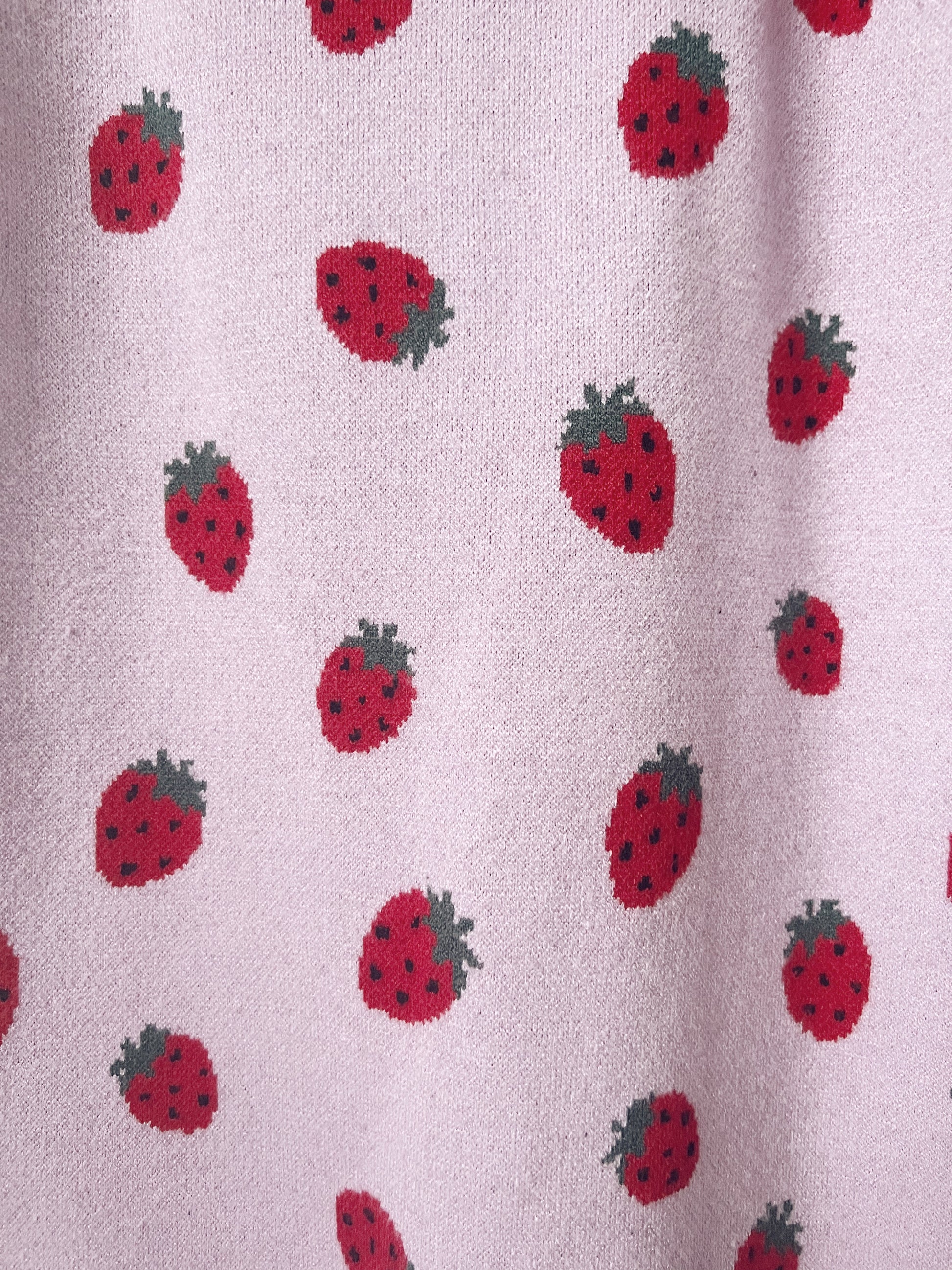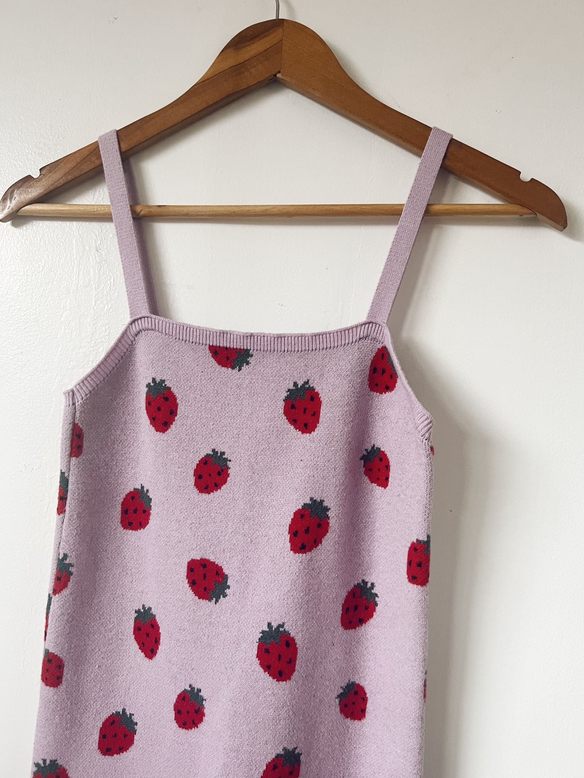 Cutesy strawberry dress. Purple. Knit and fits well. Stretchy. Great quality. Can be worn with white turtleneck inside or white fitted tshirt or as is!