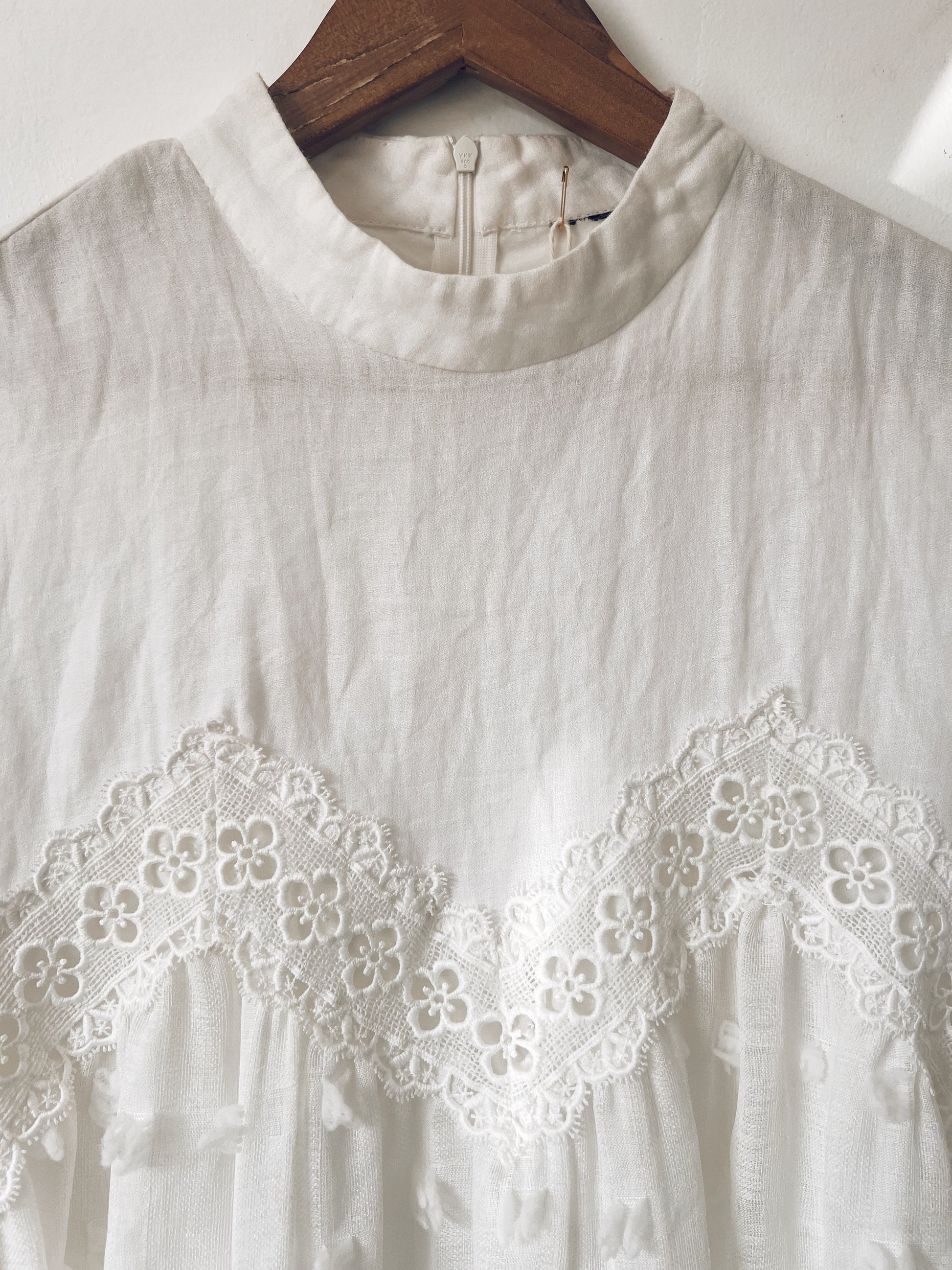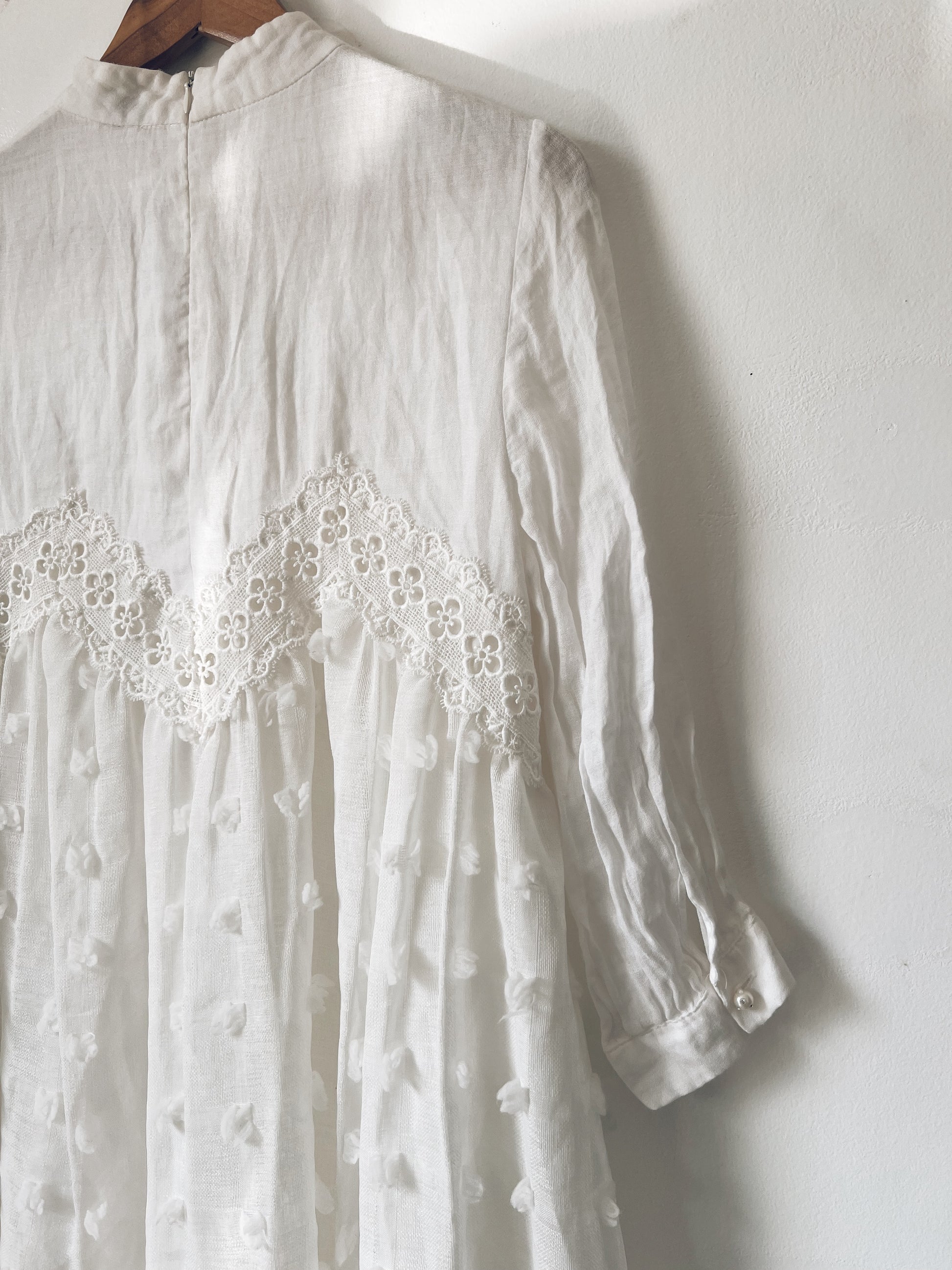 Looking for an easy to wear but lovely white dress? Here it is! 3/4 sleeves. Mock neck. Floral lace trim with bohemian vibe. Zipper closure at the back, button closure on sleeves. Flowy. Has lining.