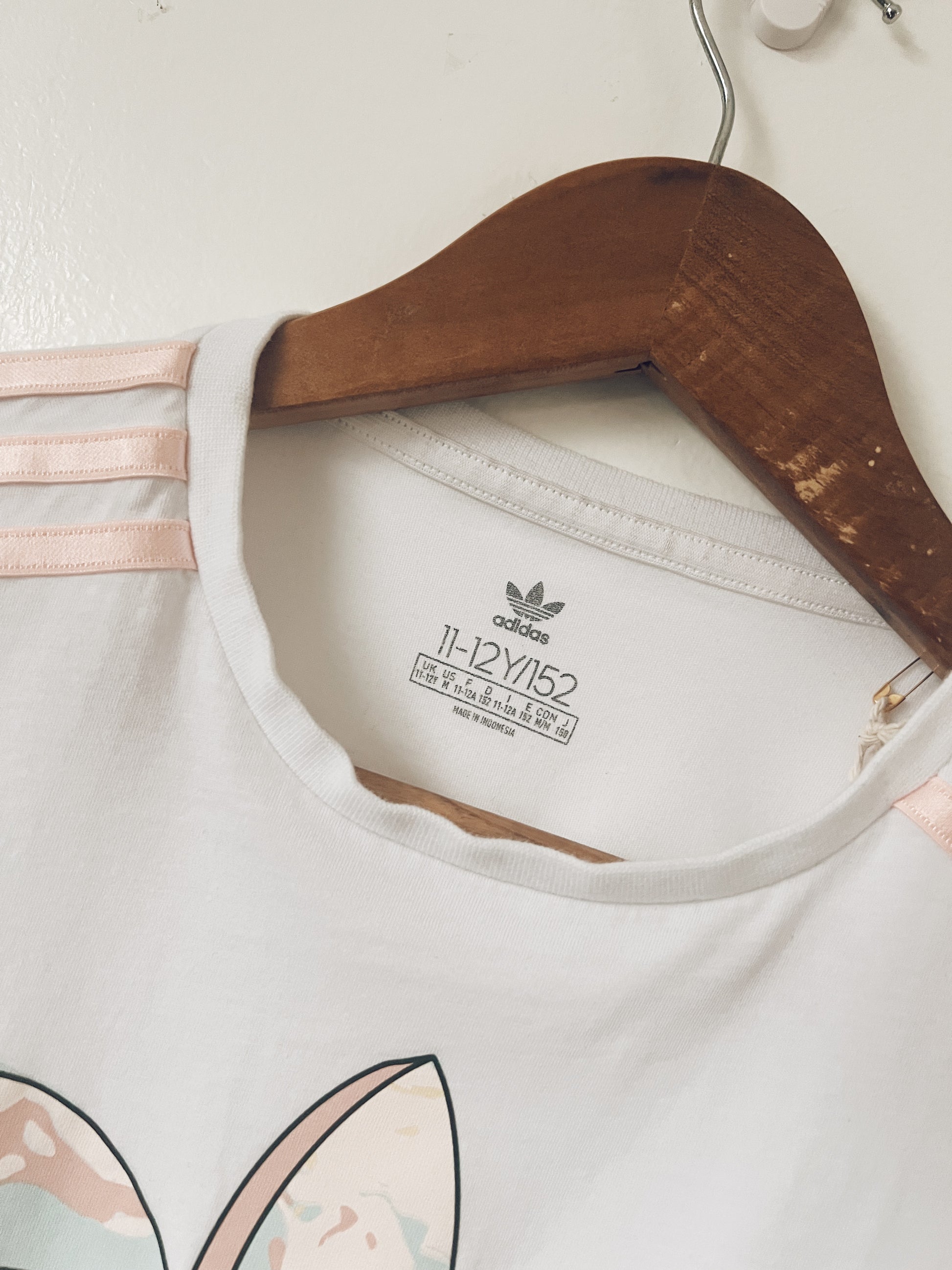 Such a cute tshirt! Pastel peach trims on the side of sleeves. Cute Adidas logo and print on the front. Soft. Perfect with jeans.