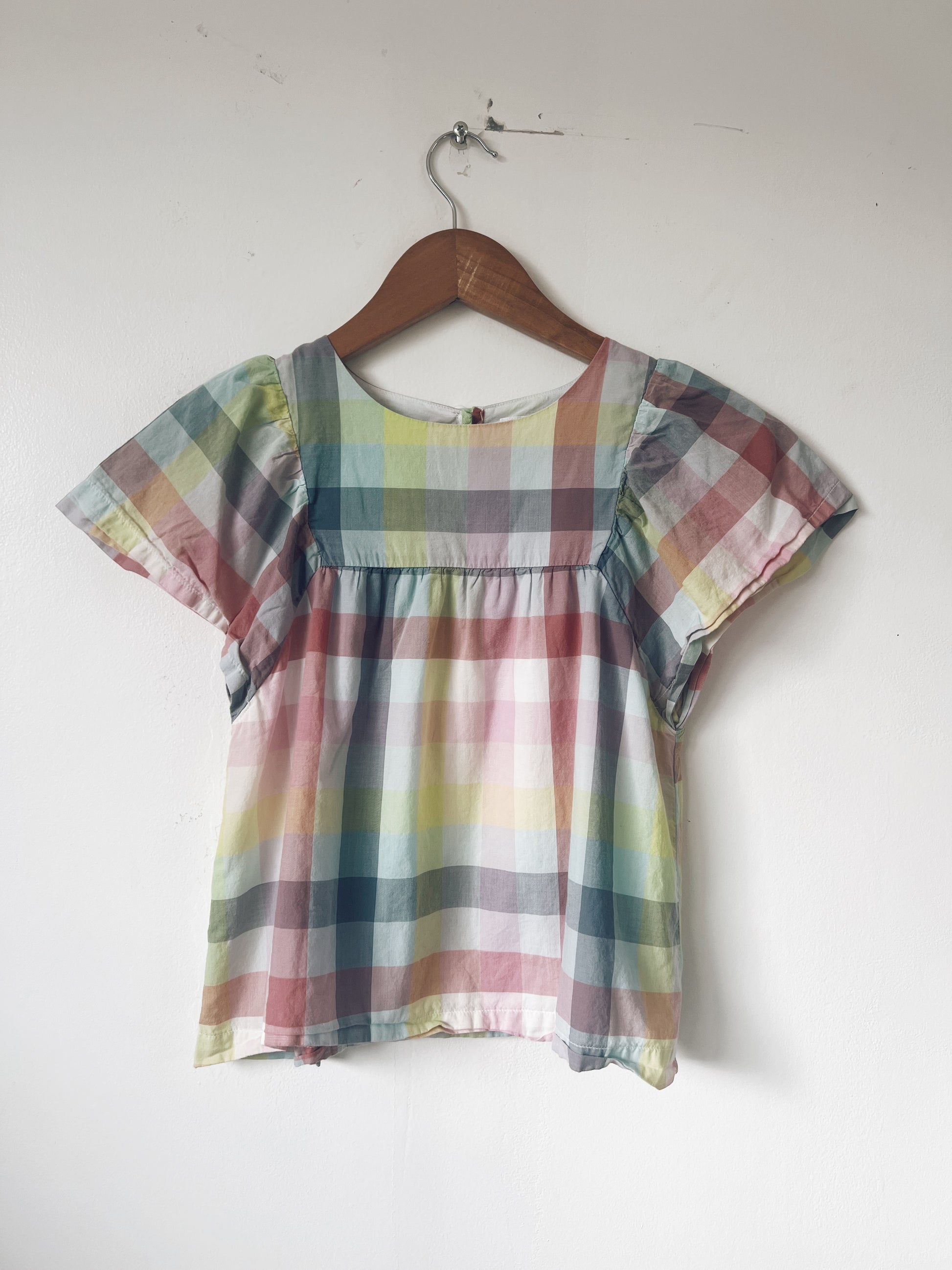 Cute, pastel colour checkered design. Flutter sleeve. Button closure at the back. Lining inside. Lightweight.