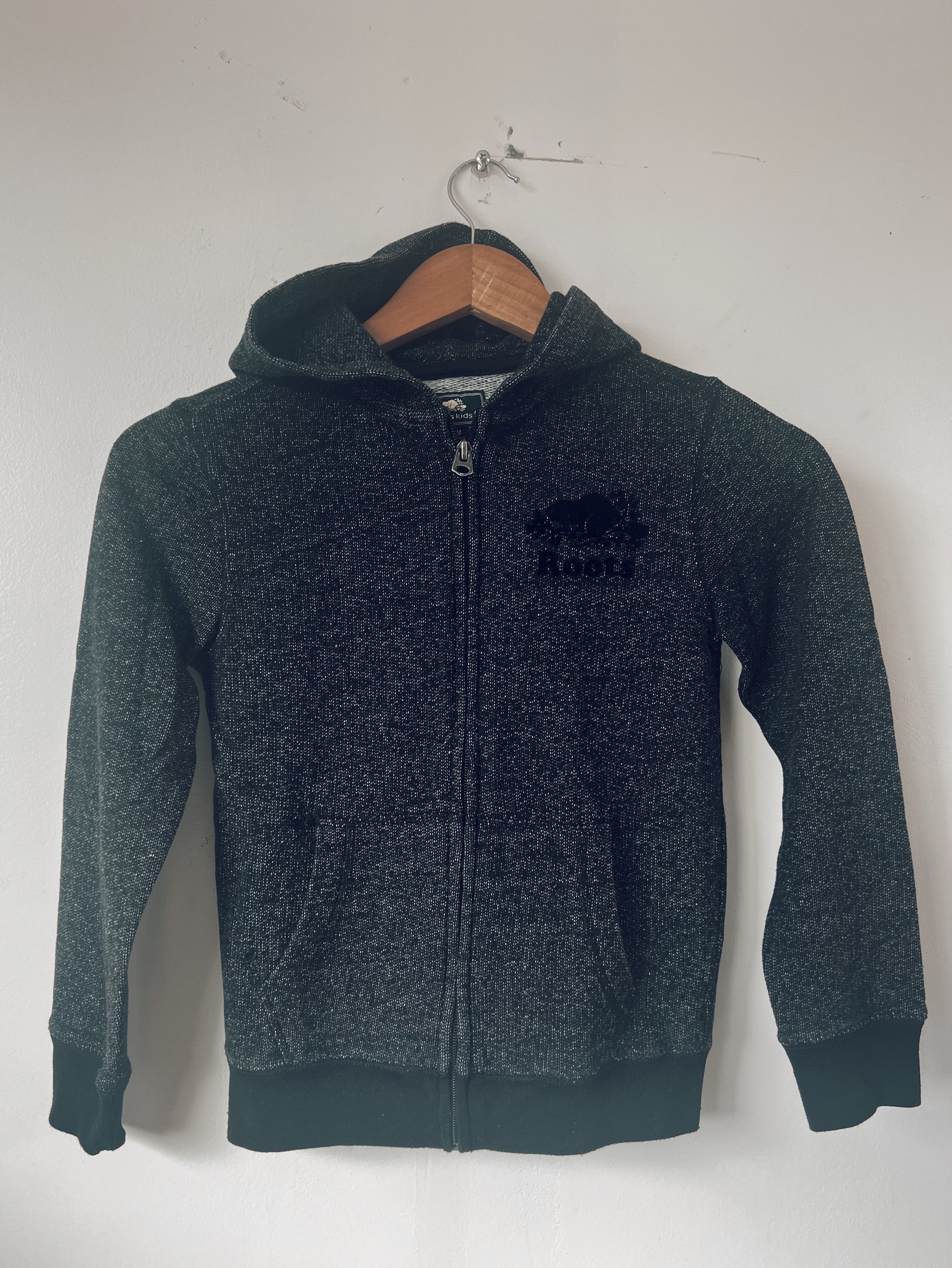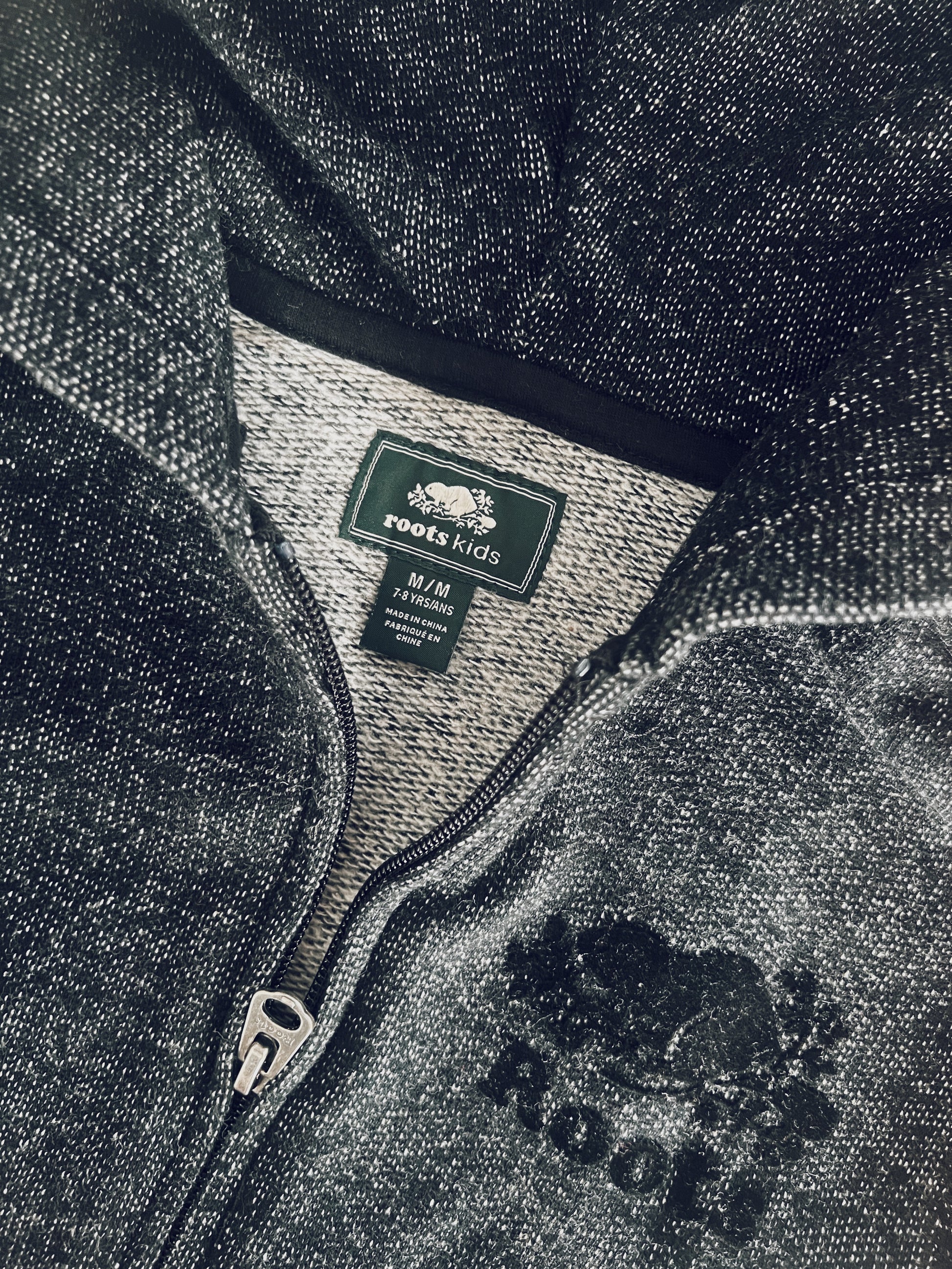 Another comfy hoodie for Baguio. Black with grey/white specks. Embossed zipper. Classic Roots logo on the front, maple leaf on hood. Pockets. Unisex.