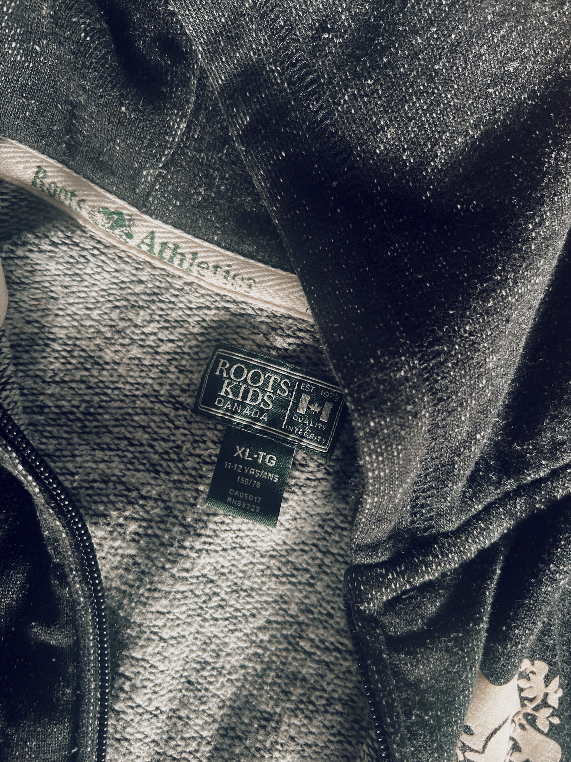 The comfiest kids’ hoodie - even the hood is so comfy. Black with grey/white specks. Embossed zipper. Signature Roots logo (front) and maple design (hood). Pockets. Unisex. Minor fading on the “Roots Athletics” design on the inner neck.
