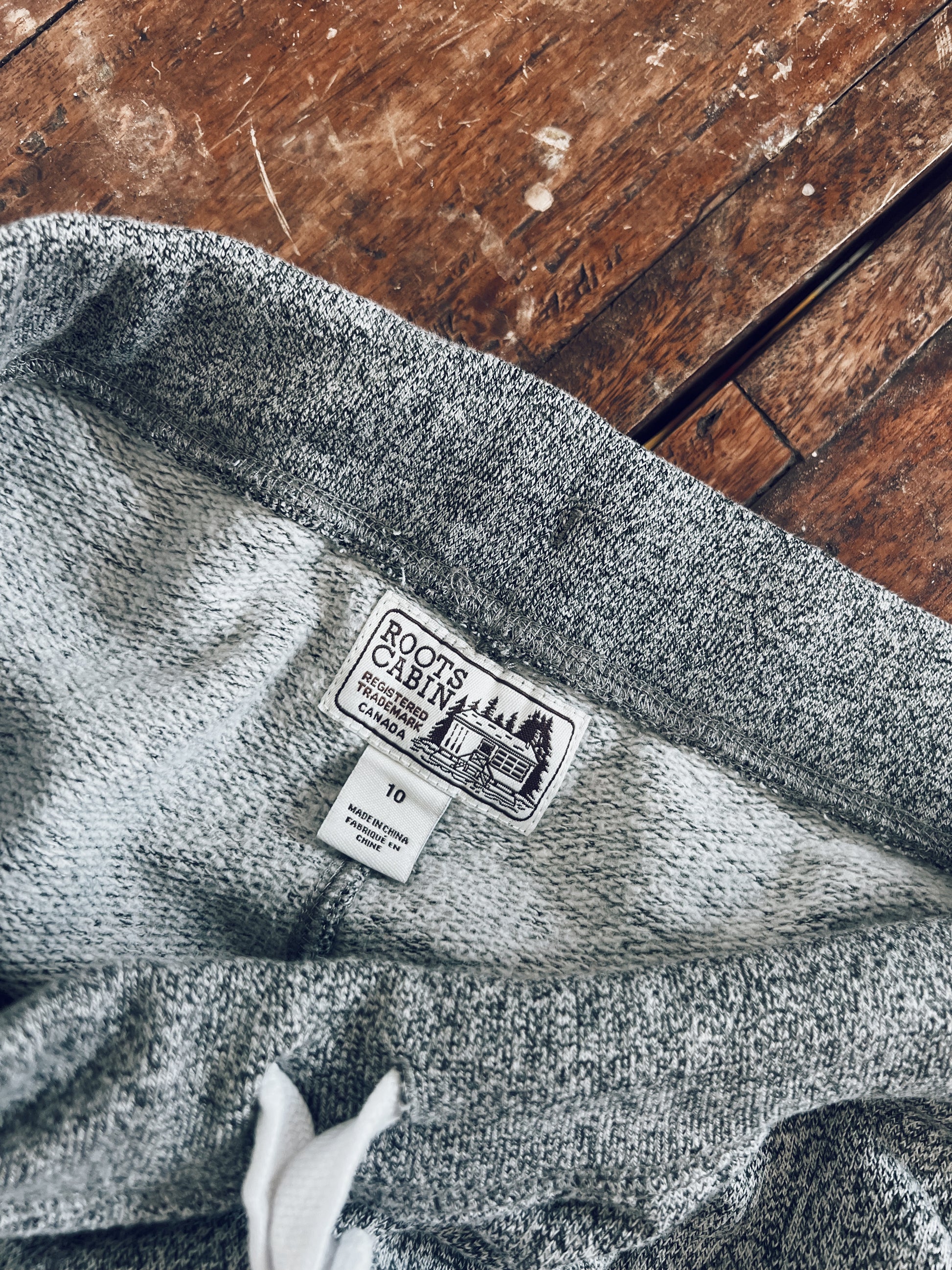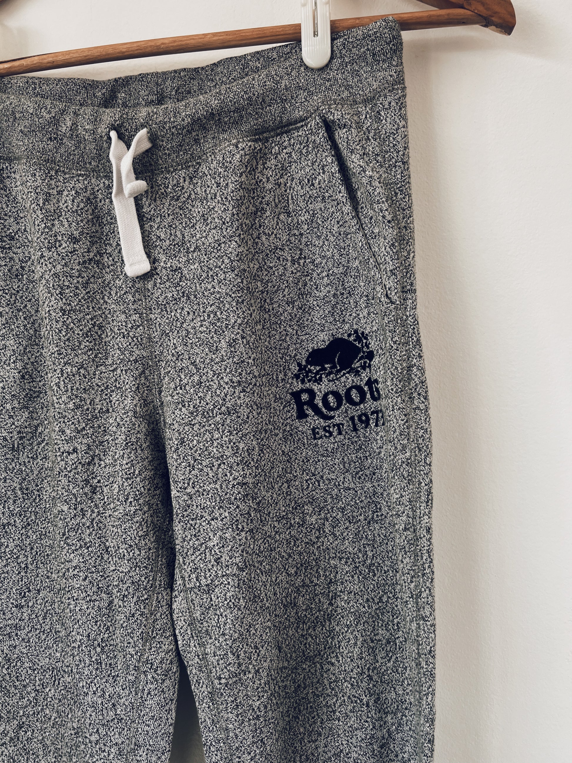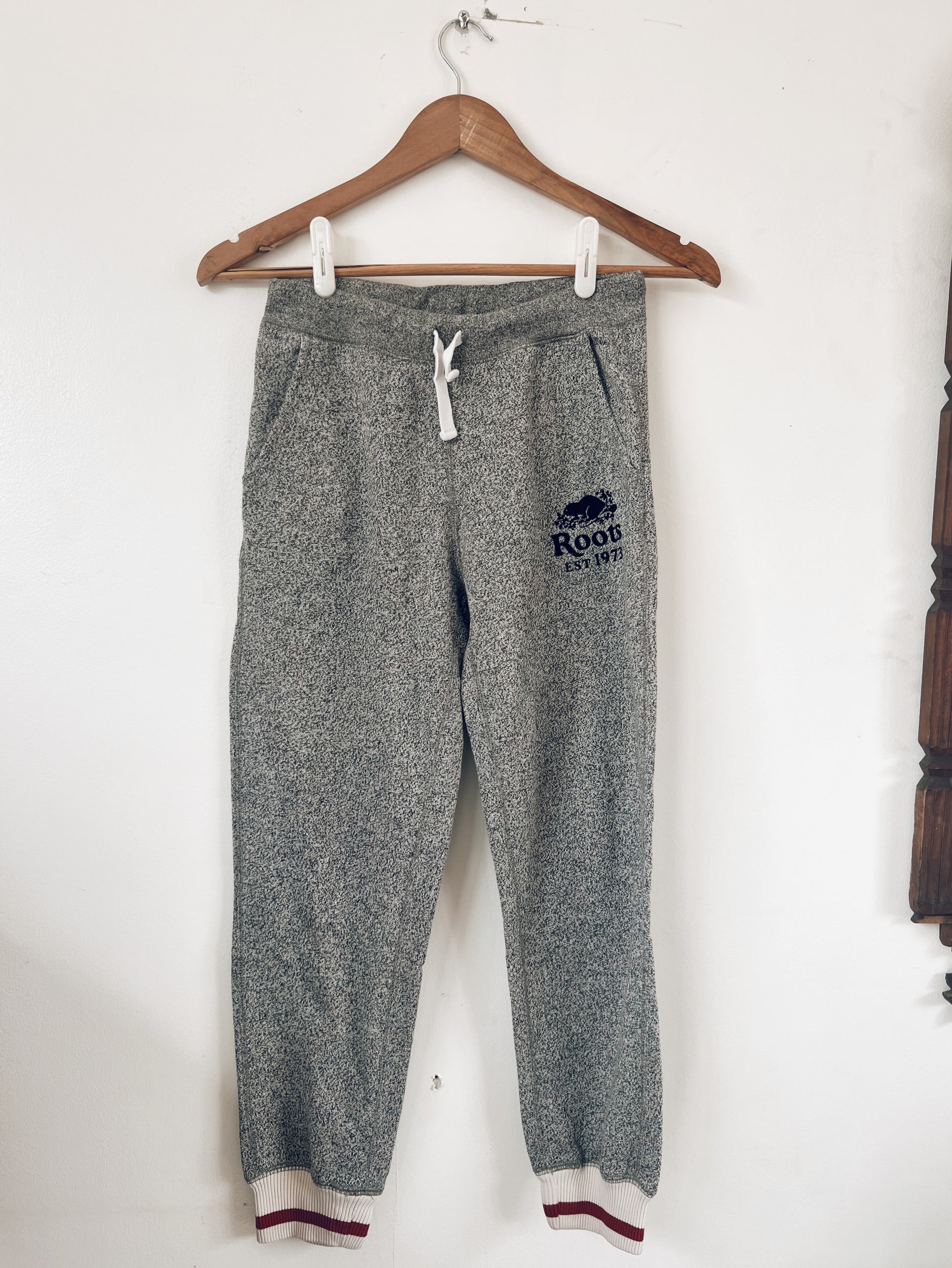Back in Canada, these sweatpants are a kids' favourite. Grey in colour. Black classic Roots logo. Drawstring on waist. Pockets on sides. White and red leg hem. Unisex. So comfy.