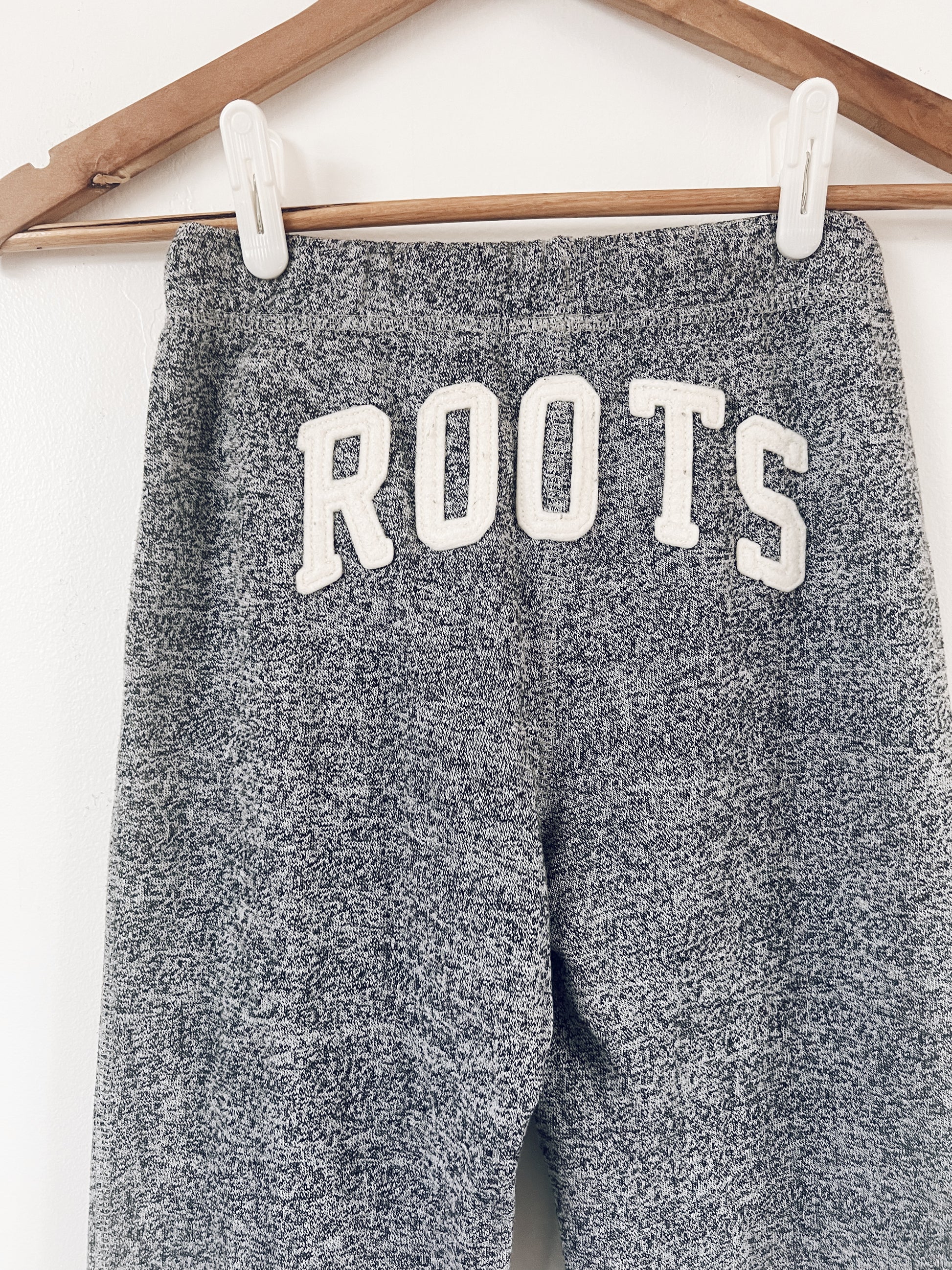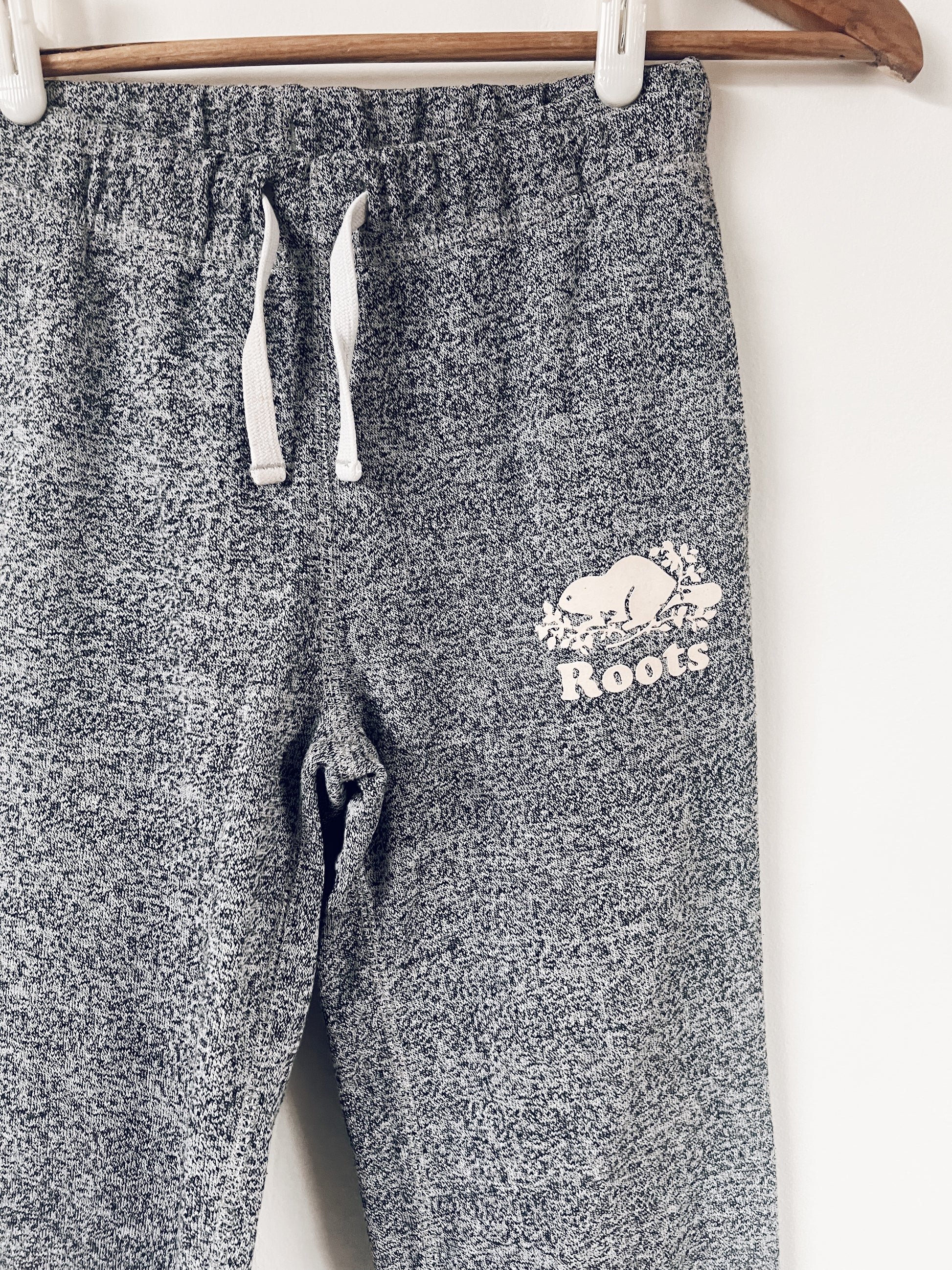Classic light grey salt and pepper sweatpants. Super duper comfy. Drawstring and secret pocket on waist. Pockets. “Roots” on the bum. Logo has a bit of crack. For kids’ lounging, watching Netflix or a quick run to 7/11 with you.