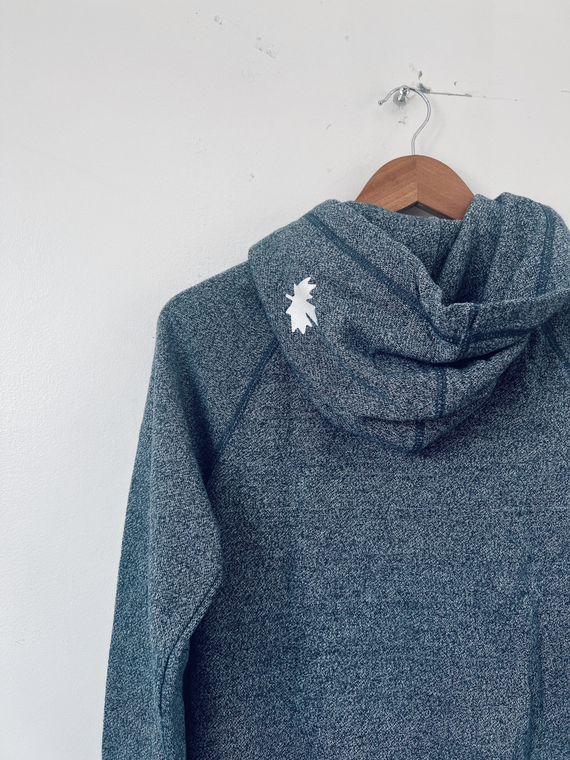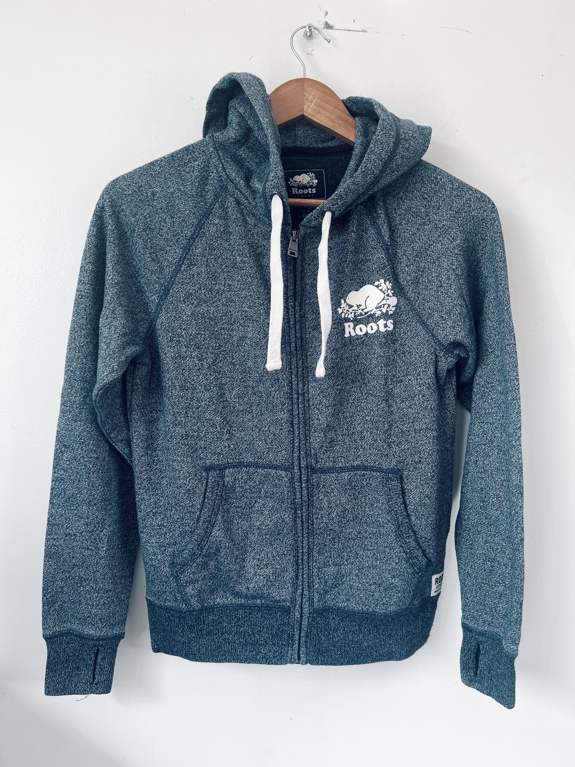 Blue zip-up hoodie with white specks. Embossed zipper, Roots logo on the front, maple leaf on the hood. Pockets on the front. Drawstring on hood, with embossed metal hole. Hole on the sleeve hem for the thumb. Unisex. An easy, grab and go hoodie.