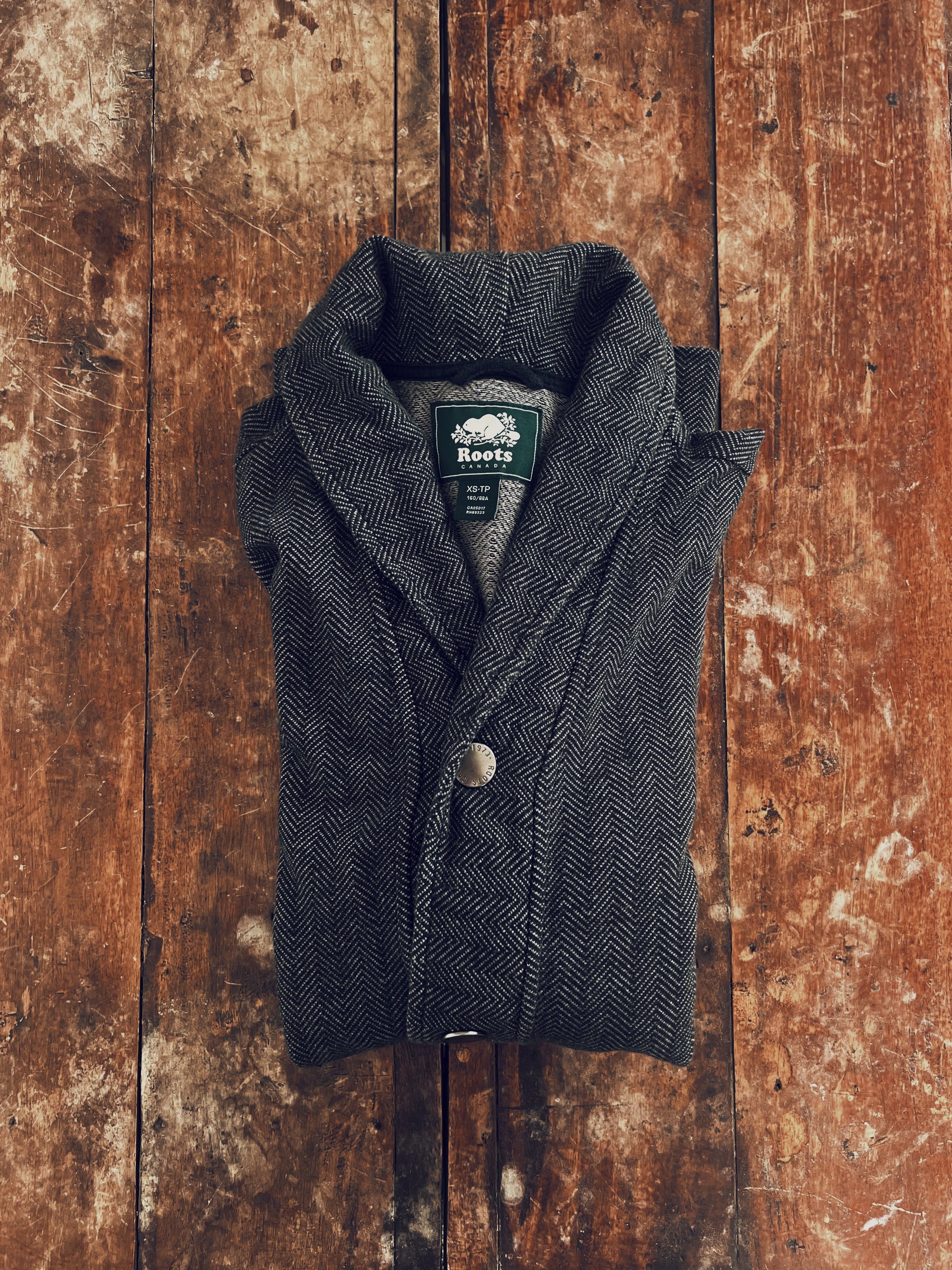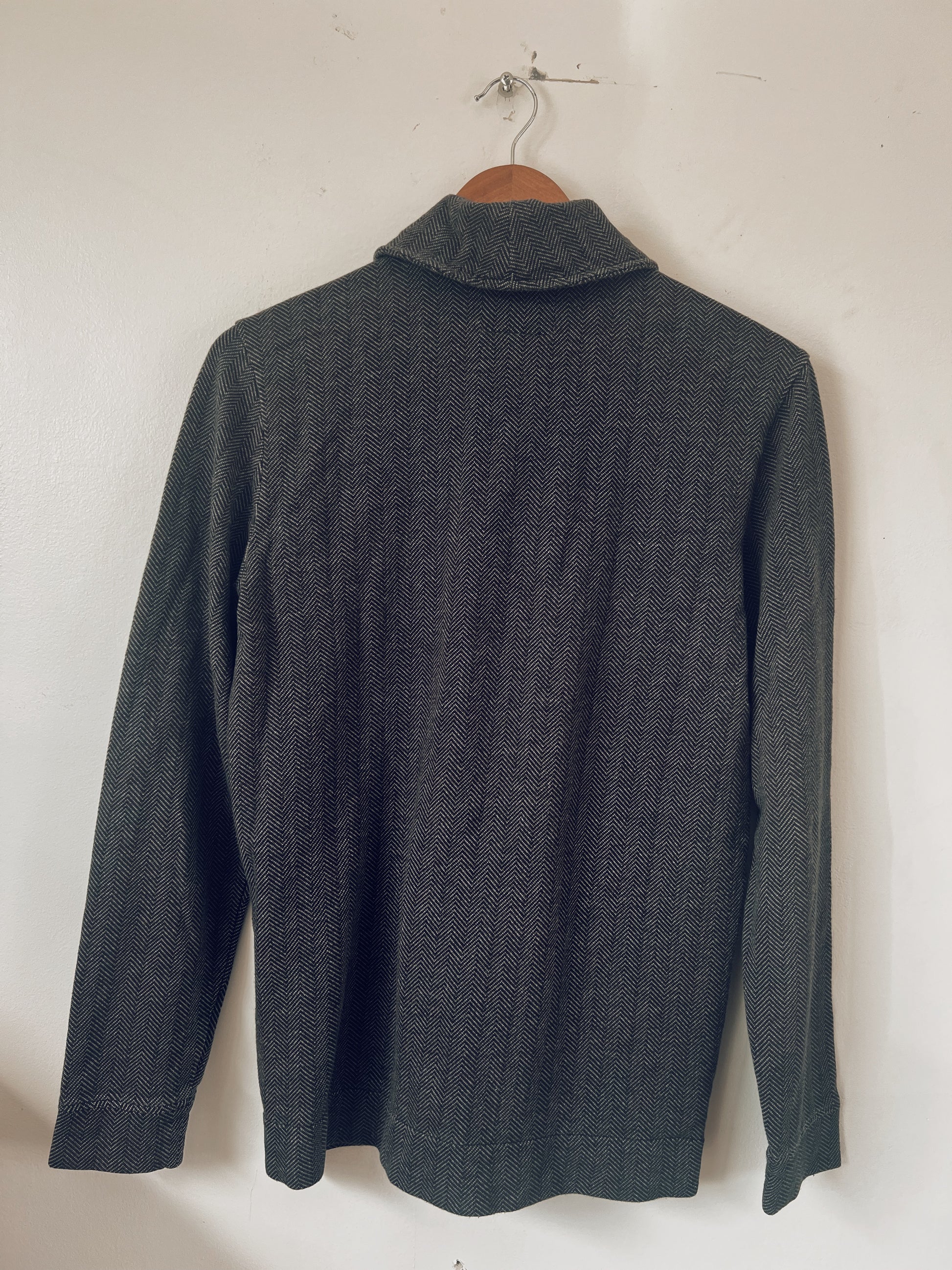 The comfiest cardigan blazer. Black and grey pattern. Embossed snaps for closure. Pockets on the front. So soft you might fall asleep if worn in the office.