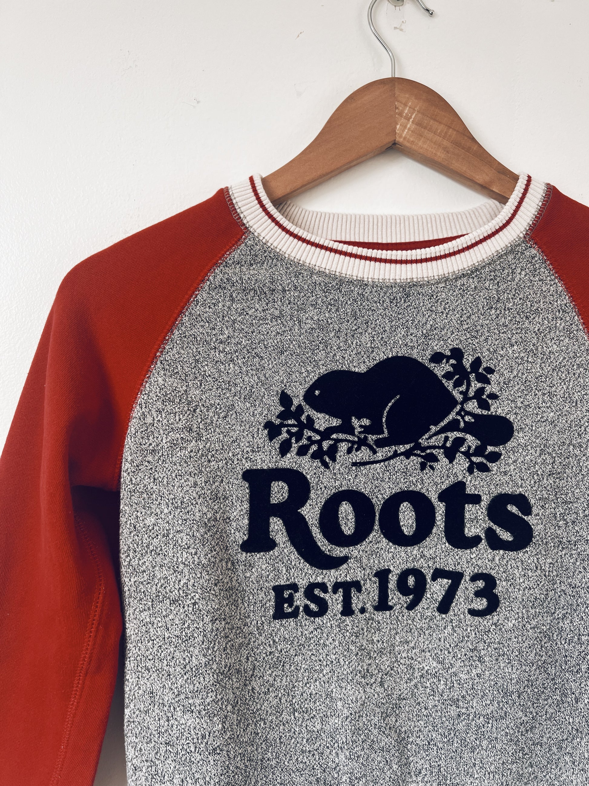 Coolest sweatshirt. Red, salt and pepper grey. Classic roots beaver and logo on the front. Great quality. Unisex. For the chilly mornings on the way to school.
