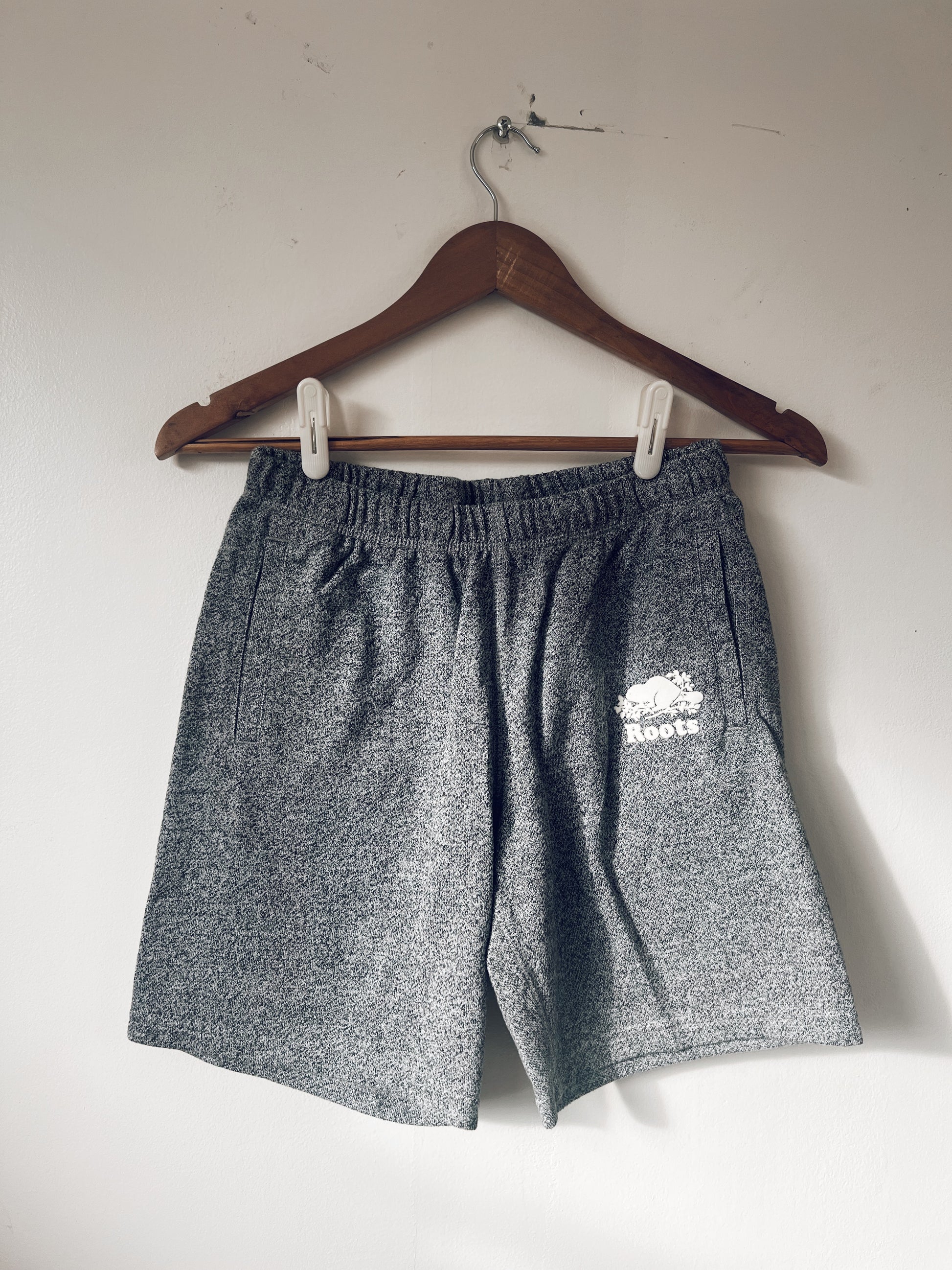 Classic salt and pepper grey shorts. Super comfy. Drawstring on the inside along with classic Roots secret pocket. Pockets. Unisex. So comfy for everyday, for lounging, for walking, for everything.