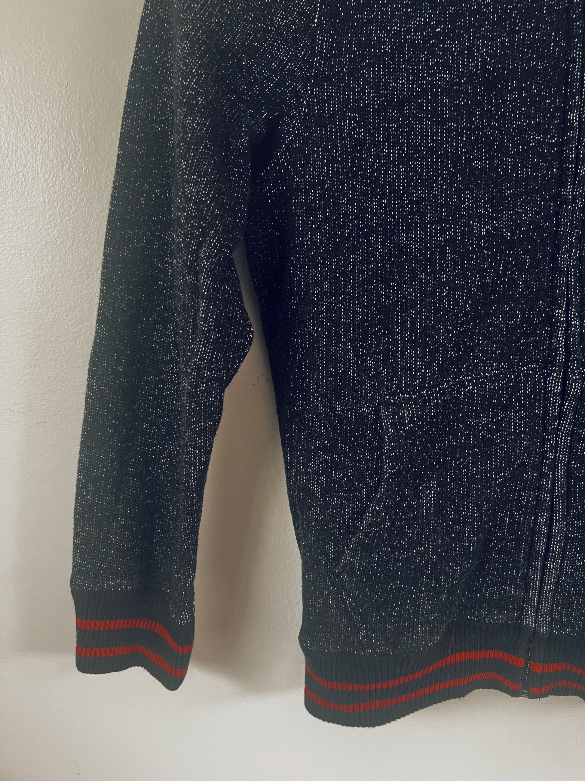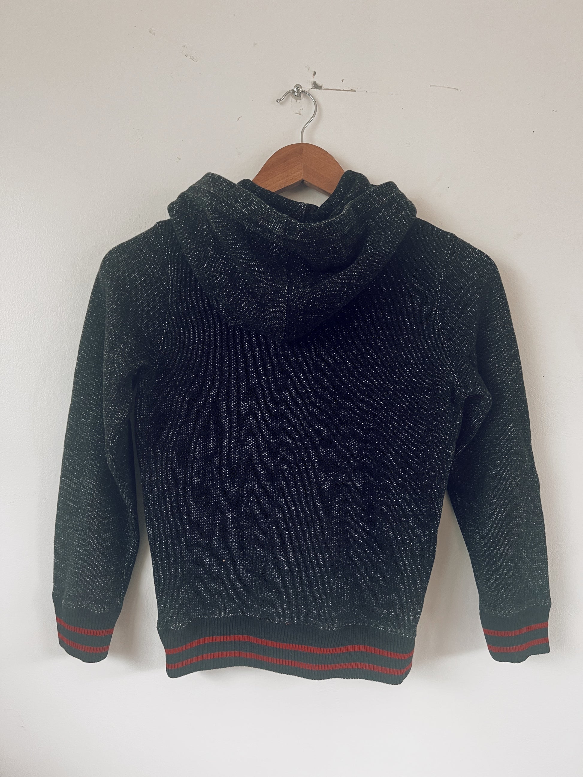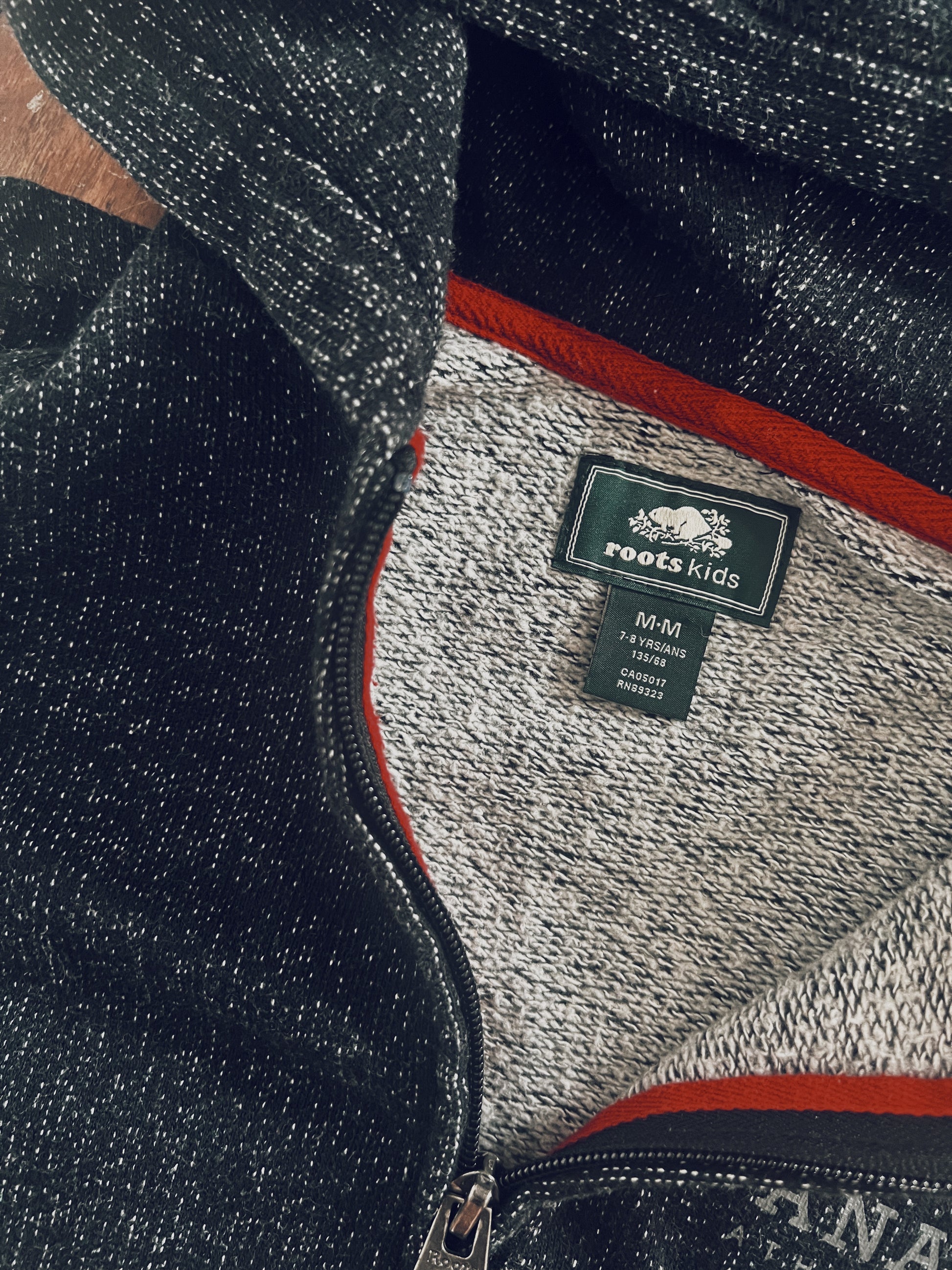 A cool and comfy hoodie. Black with white/grey specks. Black and red trim. Classic Roots Canada logo on the front. Embossed zipper. Pockets on the front. Unisex.