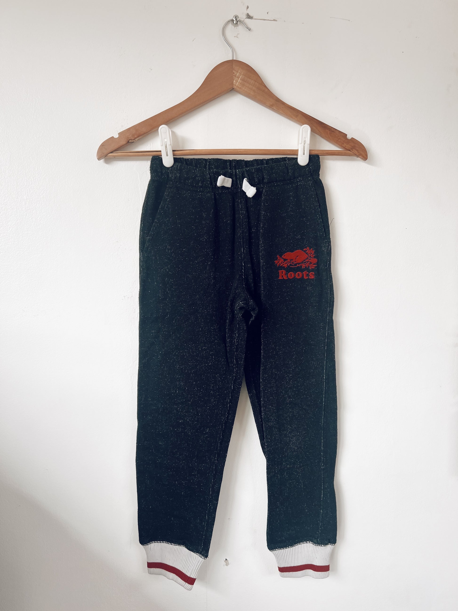 Black with grey/white specks. Classic red and embroidered Roots logo on the front. Pockets on sides. Drawstring on waist. Red and white leg hems. Unisex. Easy to wear for kids.