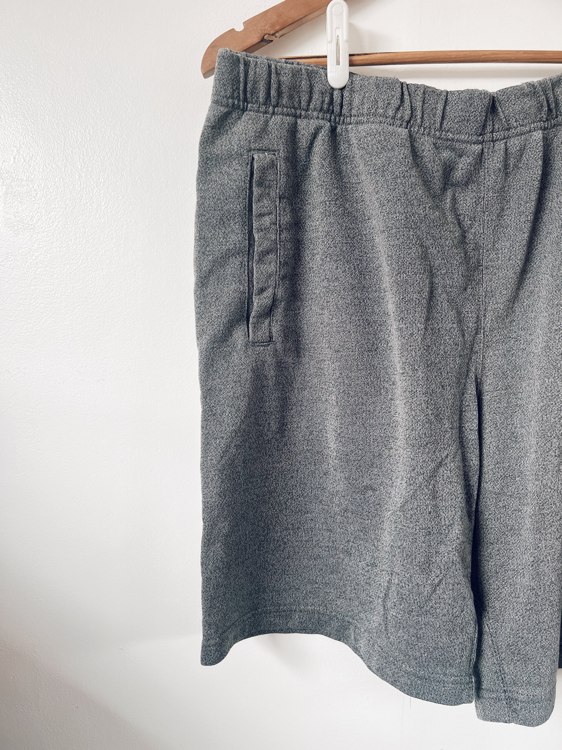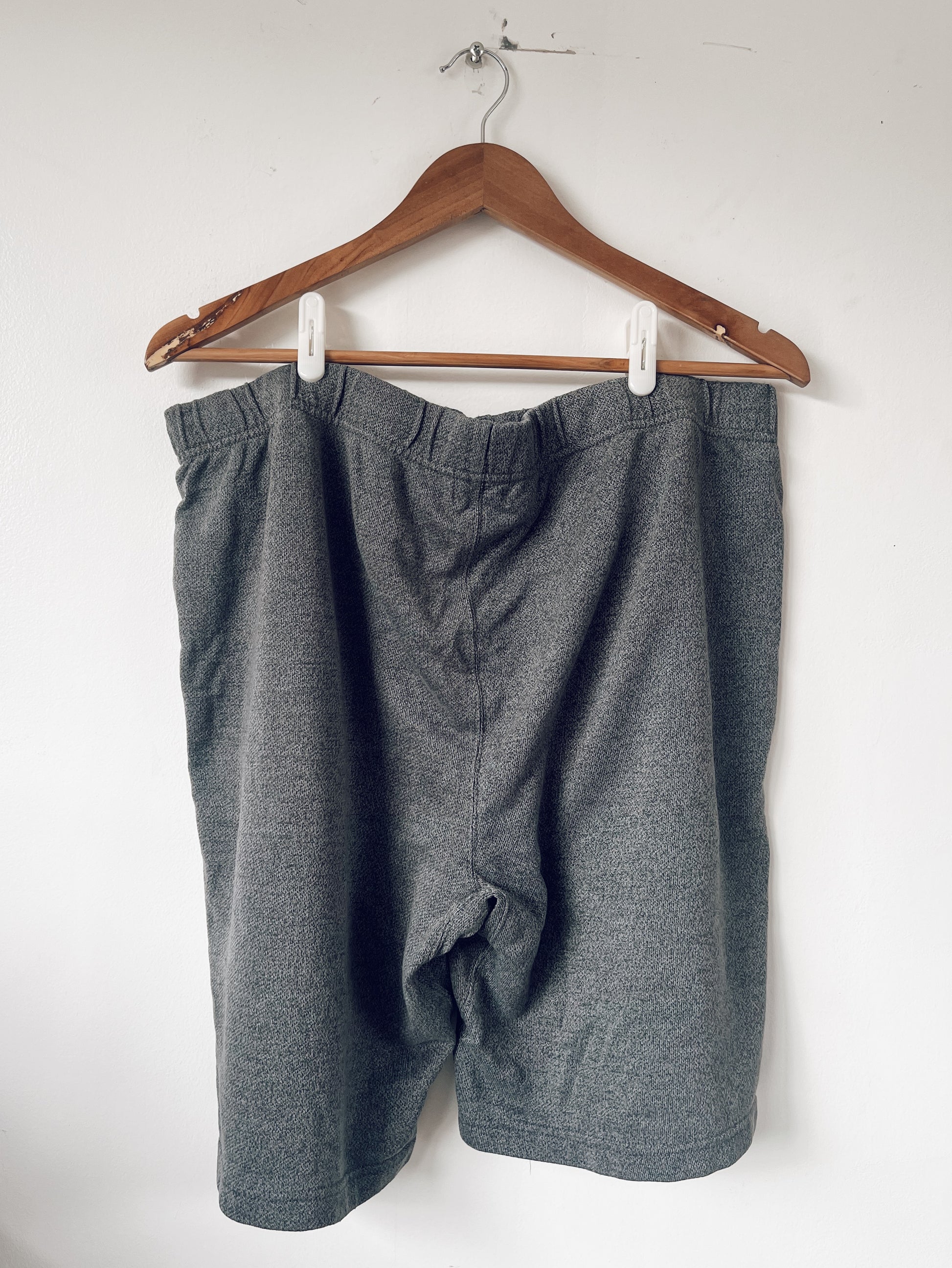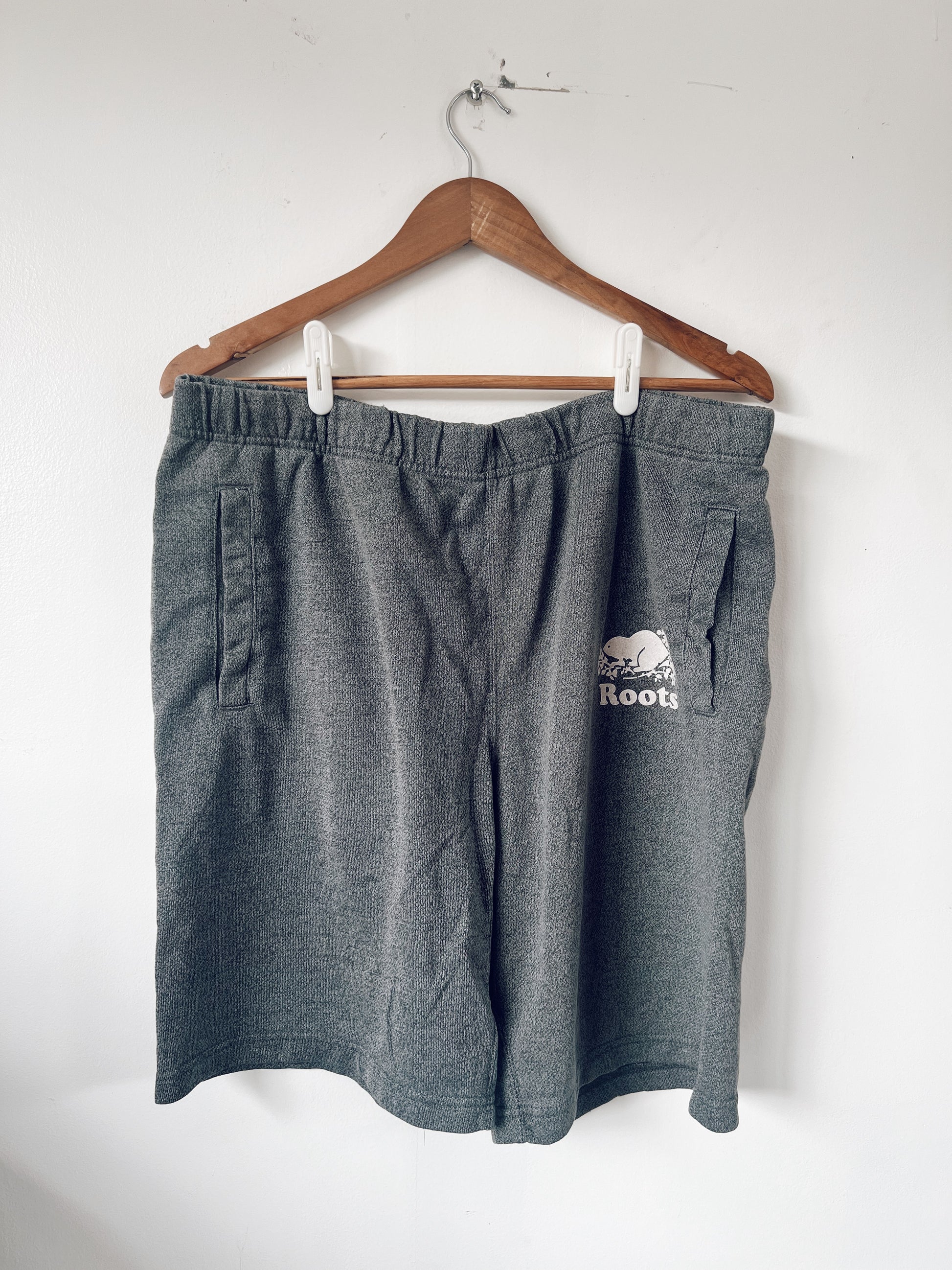 Grey shorts. Classic Roots logo on the front, a bit discoloured and cracked. Pockets on the sides. Drawstring on the inside of the waist, has some wear, see photo.