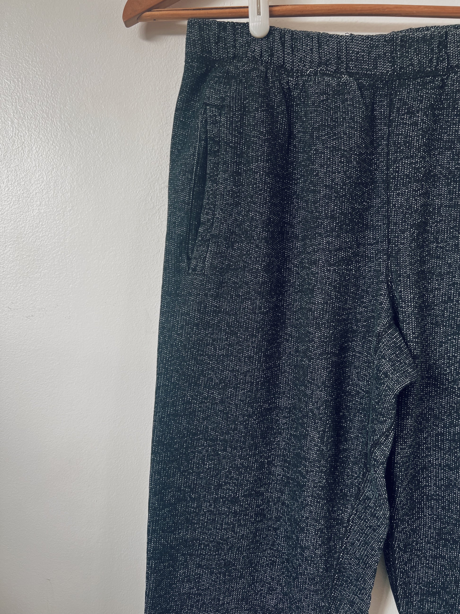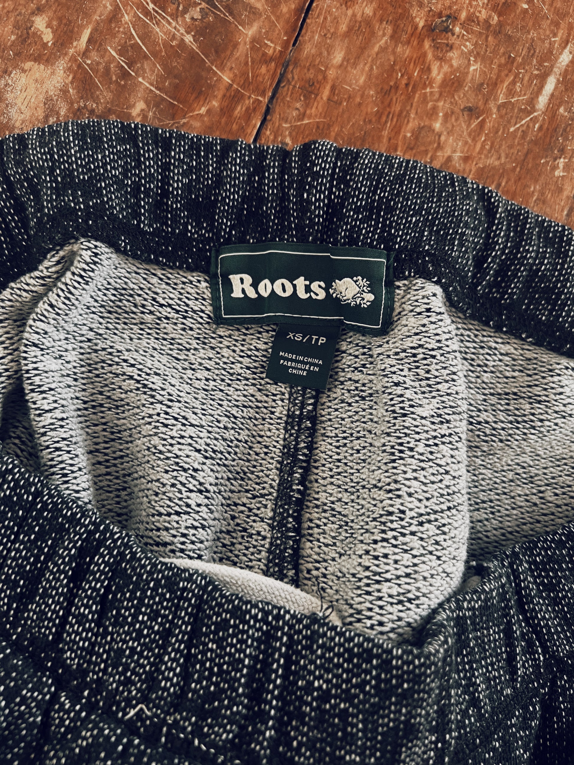 Black with grey/white specks. Classic Roots logo on the front, blackened from wear. Drawstring on the inside waist. Pockets. Unisex. Just comfy and right.