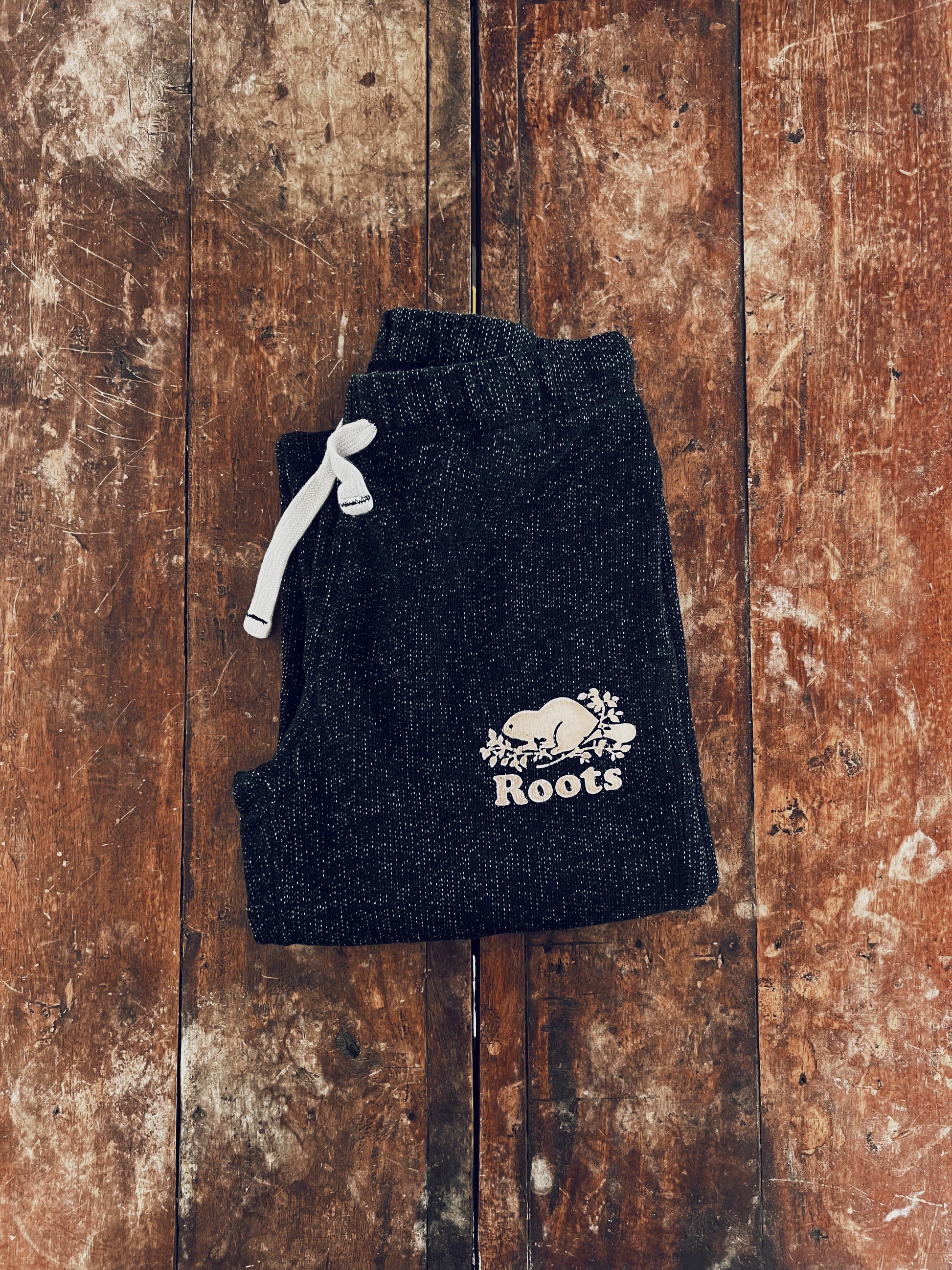 Classic black with white specks sweatpants. Roots logo on the front, a bit discoloured. Pockets on sides. Drawstring on waist. “ROOTS” on bum. Comfy, will make your kid lazy, haha!