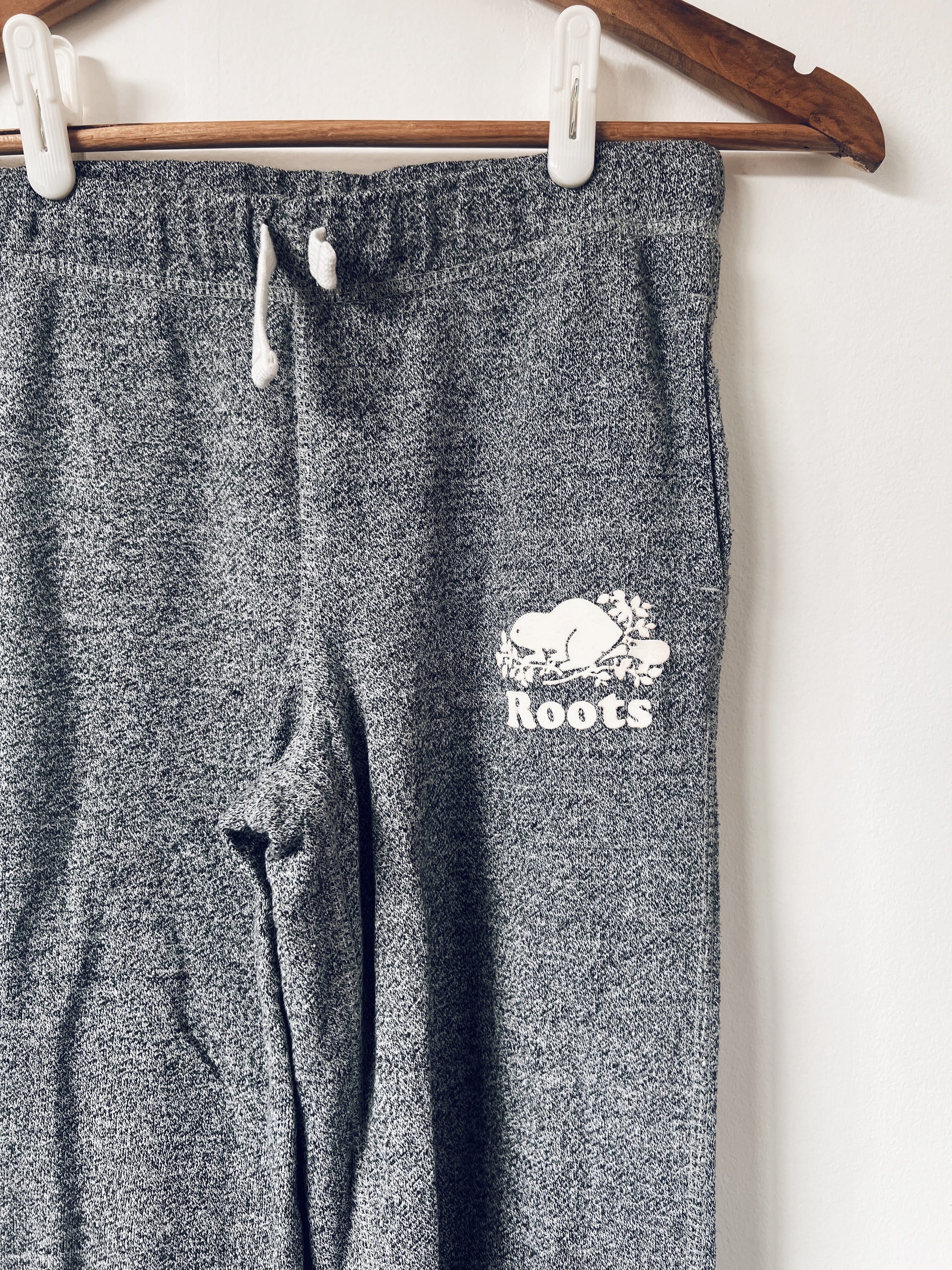 Classic grey salt and pepper sweatpants. Roots logo on the front, “ROOTS” on the bum. Drawstring and secret pocket on waist. Pockets on sides. Coooomfy.