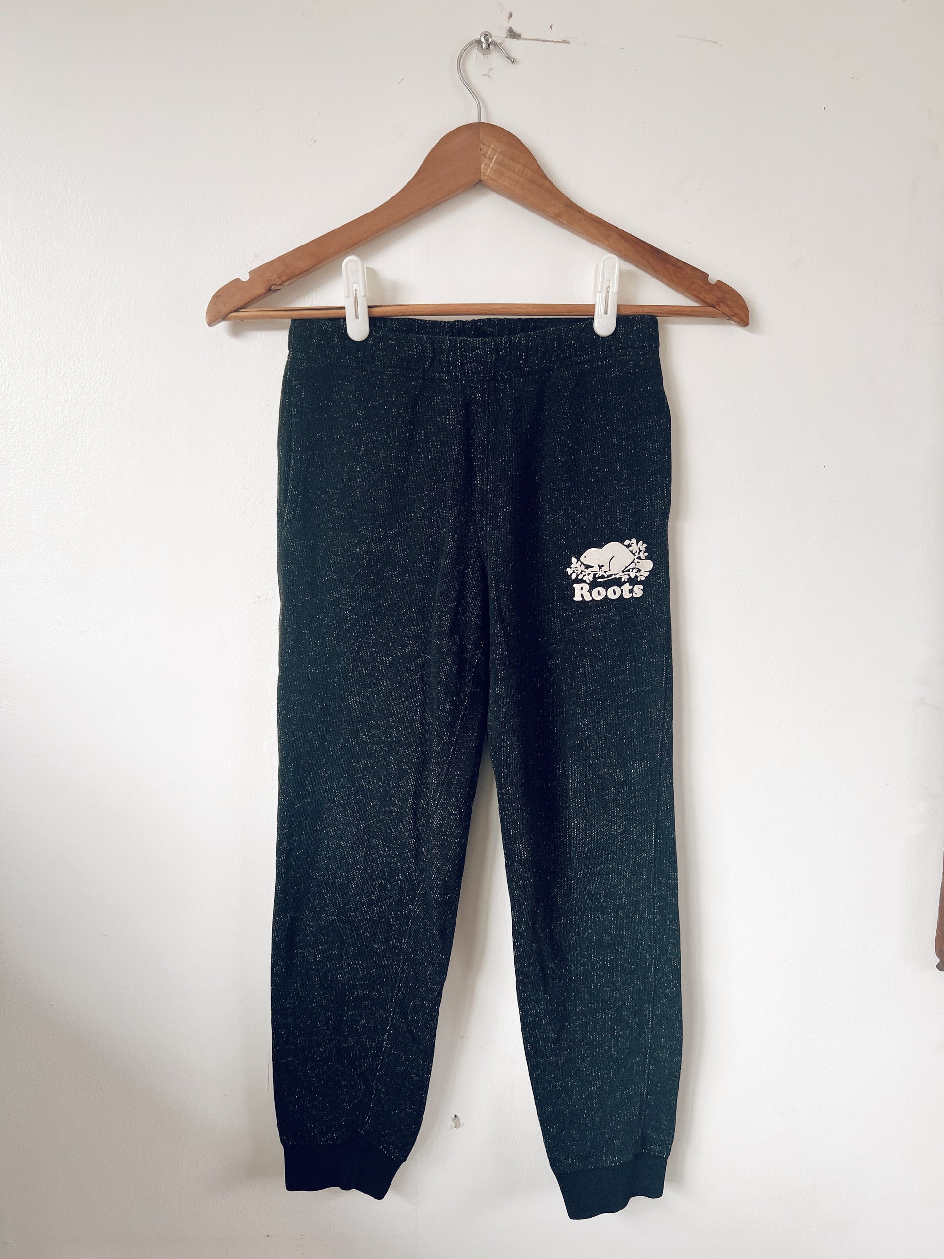 Another comfy sweatpants for kiddos! Black with white specks. Classic Roots logo on the front. Red drawstring on the inside of the waist. Pockets on sides. Unisex.
