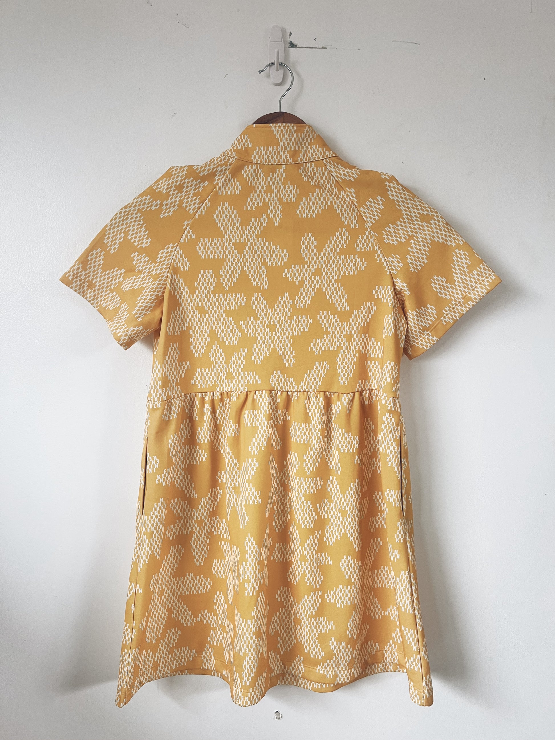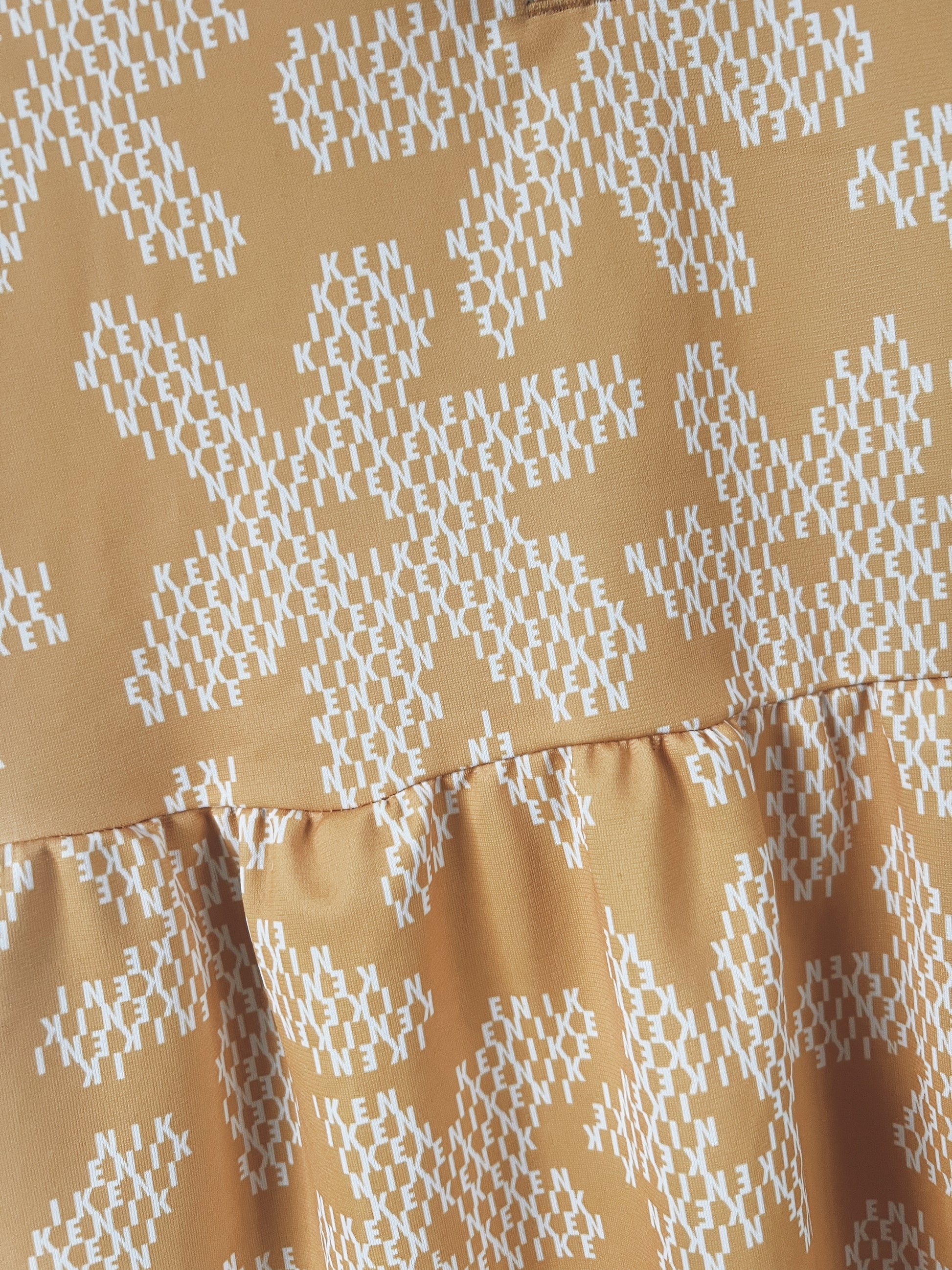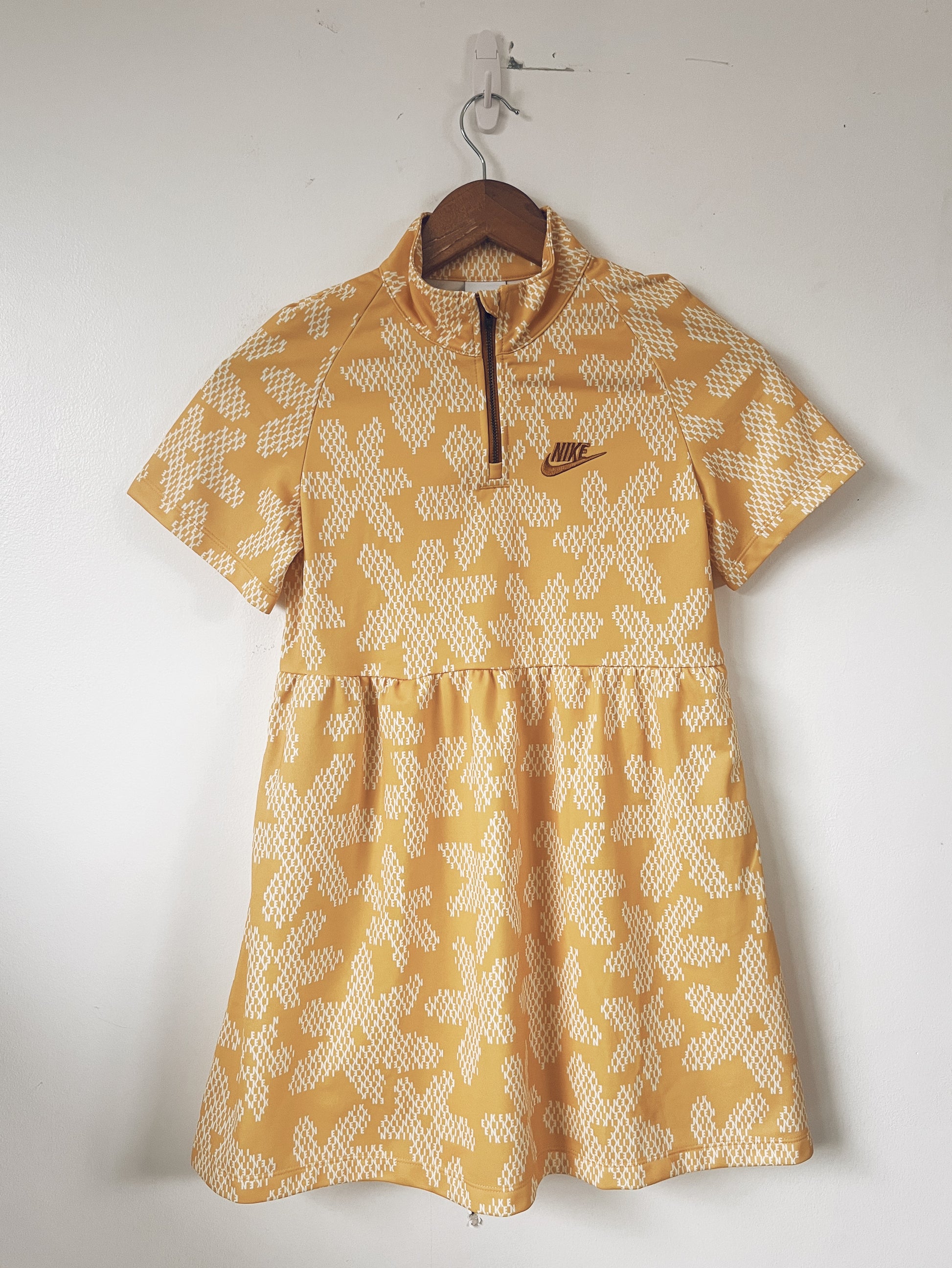 Yellow sunshine Nike dress! Vibrant yellow. Floral patterned “Nike” all over. Zipper closure on the front. Mock neck. Pockets on the side. Embroidered Nike logo. Amazing with Nike kicks!